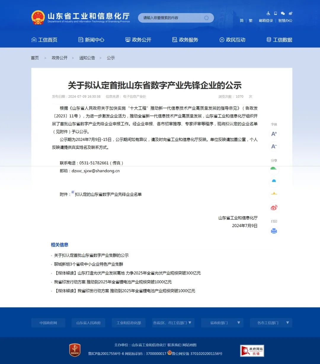 山东省工业和信息化厅公布了