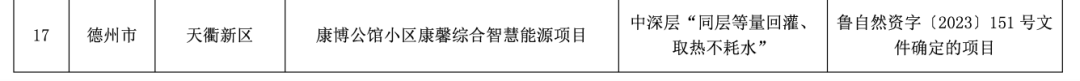 其中,康博公馆小区康馨综合智慧能源项目(“地热能+”多能互补)、天衢新区地矿局水文二队中深层地热能供暖改造项目(“取热不取水”实验项目)和天衢新区财金智慧农业大棚地热矿区地热供暖项目(地热能服务乡村振兴类)入选山东省地热能试点工程创建名单。