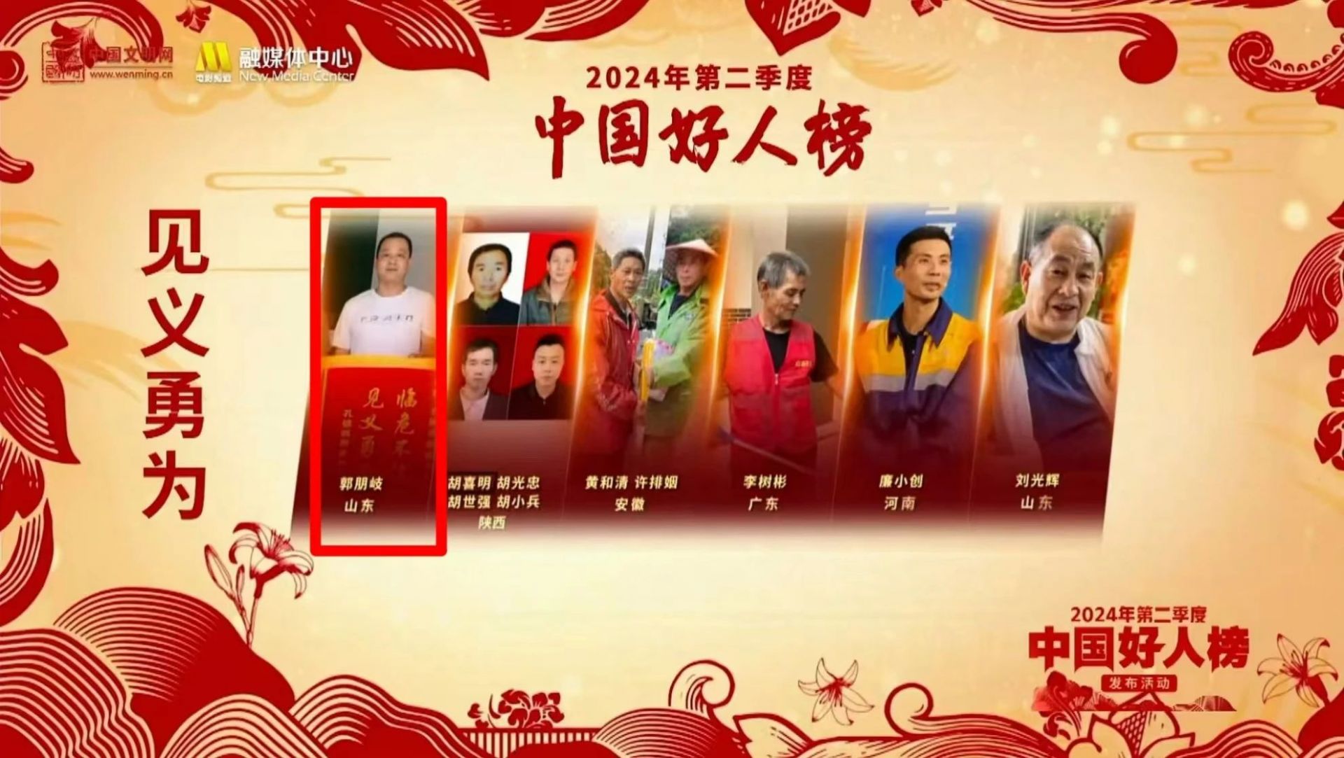 7月30日下午,2024年第二季度“中国好人榜”发布仪式暨全国道德模范与身边好人现场交流活动在山西省大同市举办,现场发布了助人为乐、见义勇为、诚实守信、敬业奉献、孝老爱亲五类身边好人名单。乐陵郭朋岐获评见义勇为类中国好人。