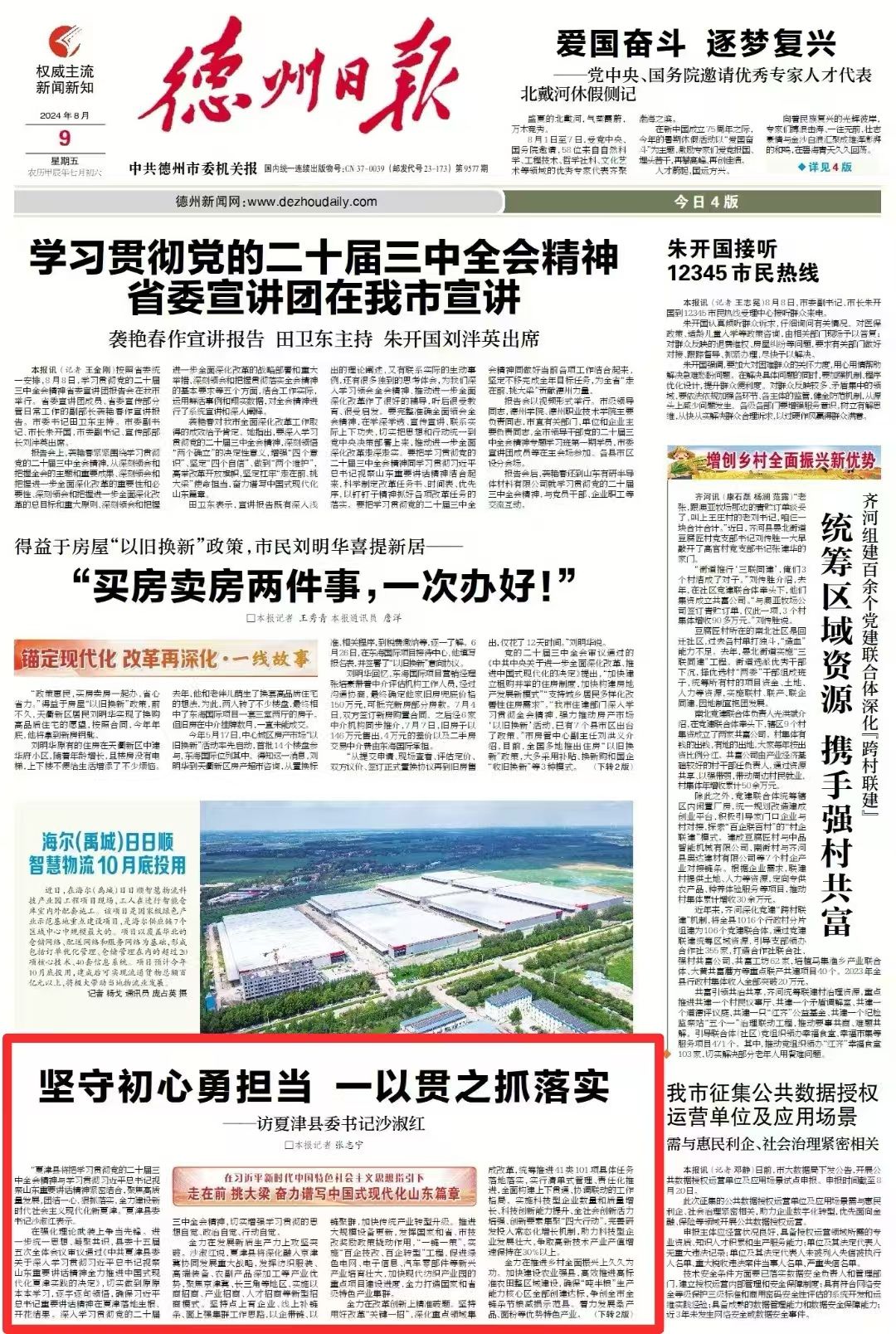 “夏津县将把学习贯彻党的二十届三中全会精神与学习贯彻习近平总书记视察山东重要讲话精神紧密结合,聚焦高质量发展,团结一心,狠抓落实,全力建设新时代社会主义现代化新夏津。”夏津县委书记沙淑红表示。