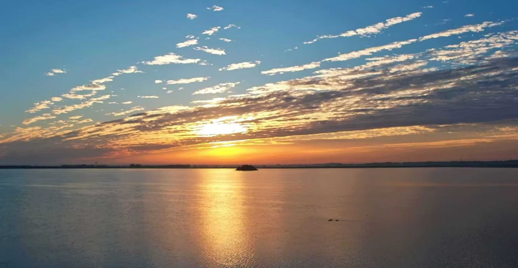 黄昏时分,厚重的云层占据九龙口国家湿地公园、惠津湖水库的天空,夕阳乘着点点缝隙,迸射出束束红色霞光,仿佛群龙在云端遨游,偶尔不慎泄露了身形,翻腾出金色的粼光。