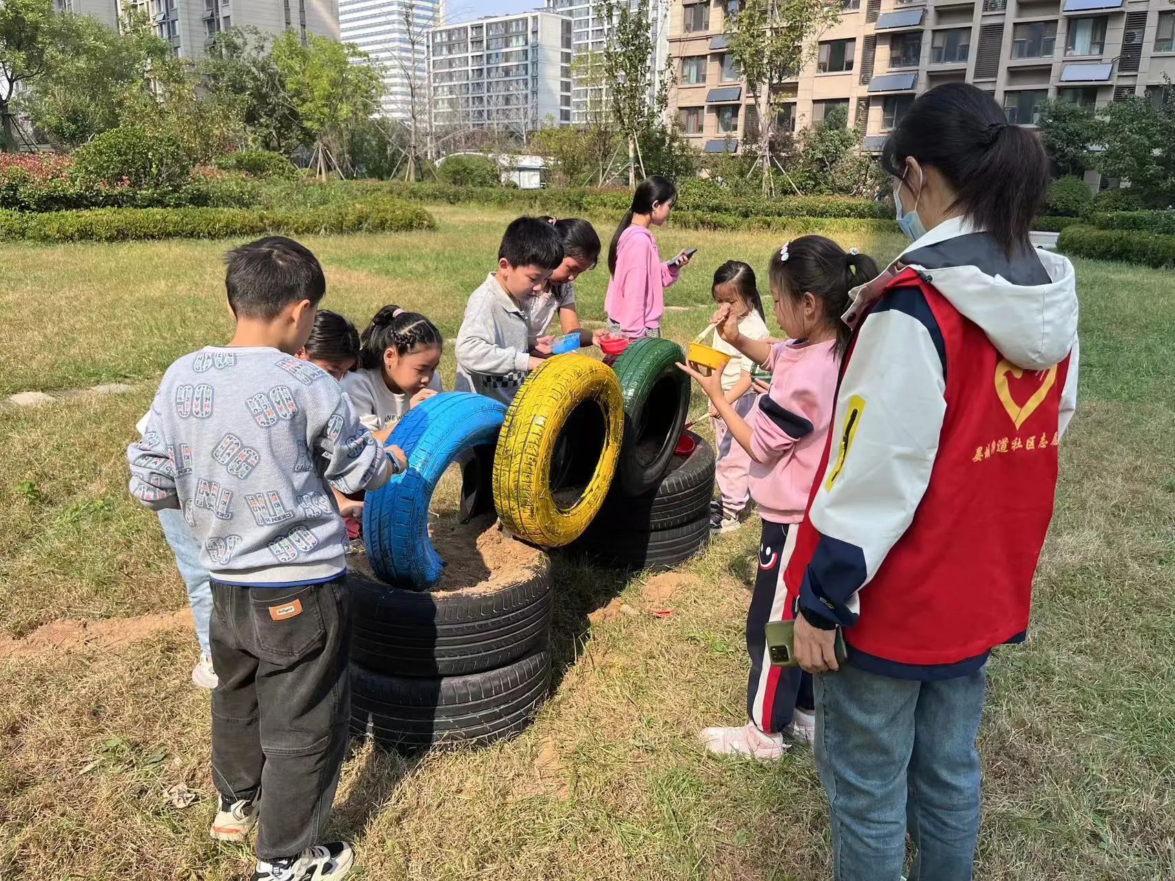 在孩子们认真涂色的过程中,家长们也在一旁耐心地陪伴着,不时给予孩子们一些建议和鼓励。经过一段时间的努力,一个个原本黑乎乎的轮胎在孩子们的手中变得色彩斑斓、充满生机。