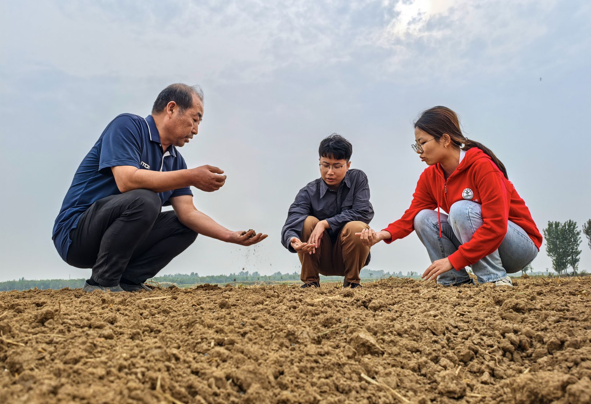 乐陵市王木腿微藻生物肥冬小麦增产提质推广示范区示范区,乡村振兴科普队队员在查看造墒情况。