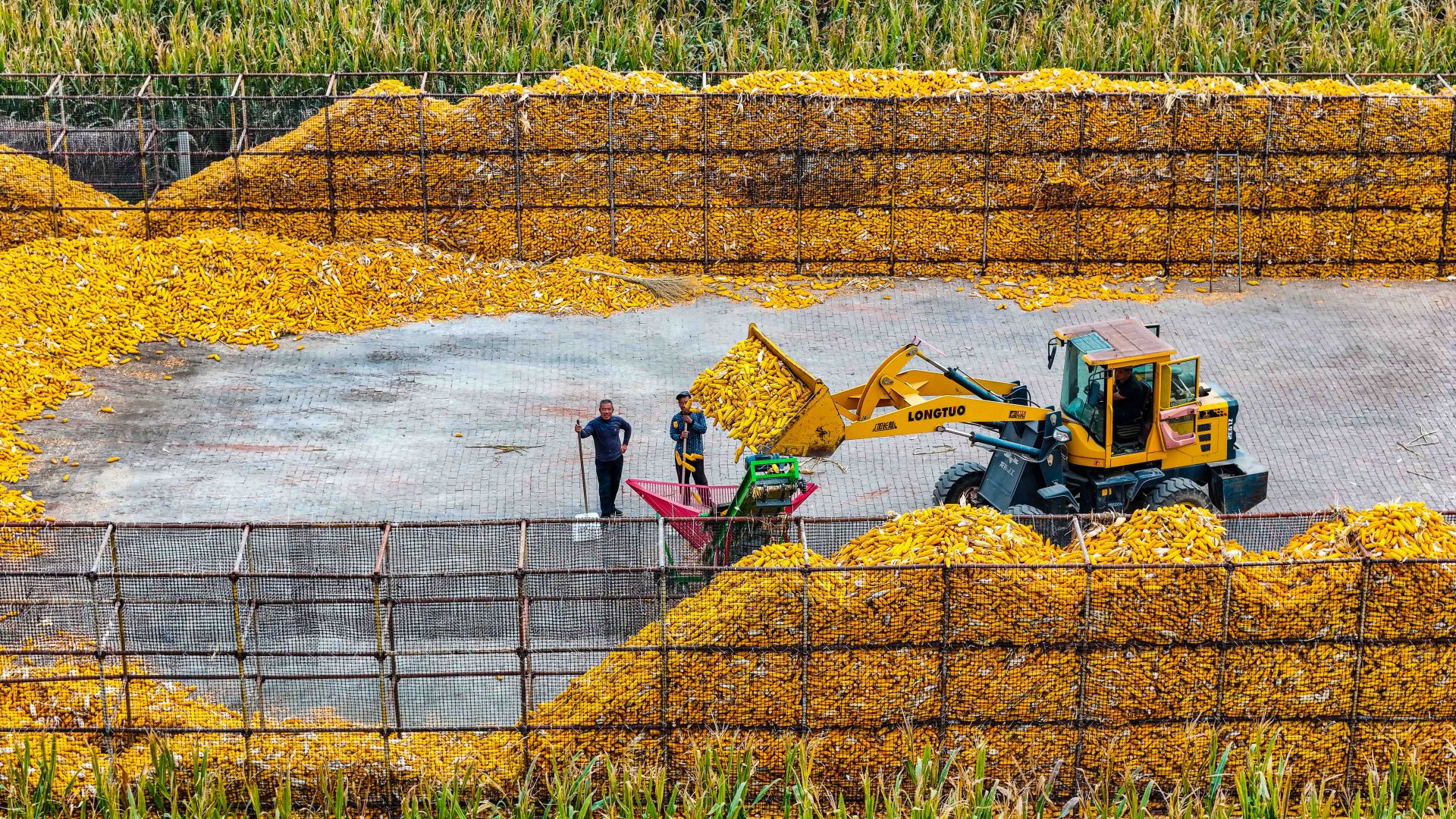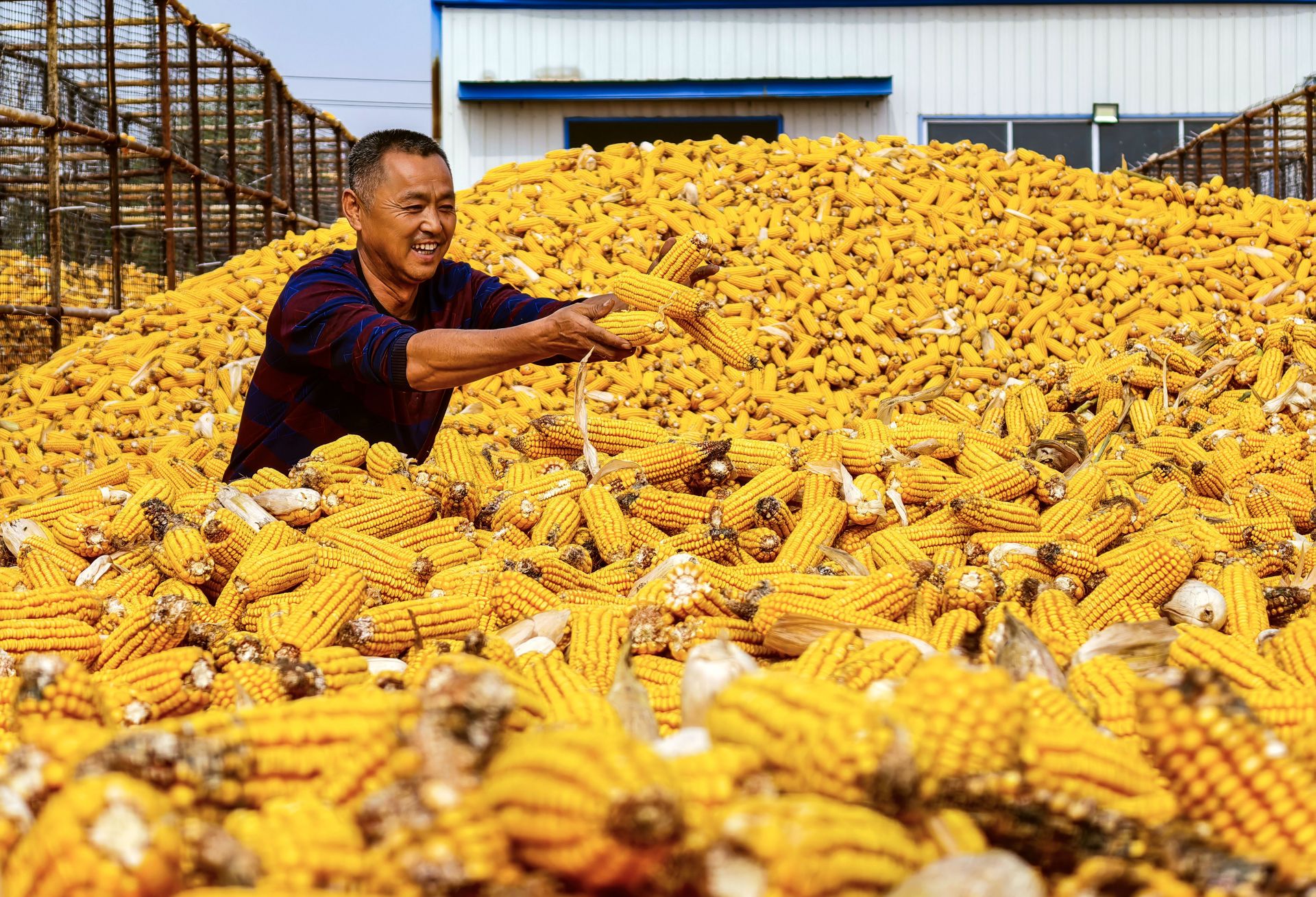 乐陵市黄夹镇德鑫生态种植家庭农场,农场主将收获的玉米装入临时粮囤。