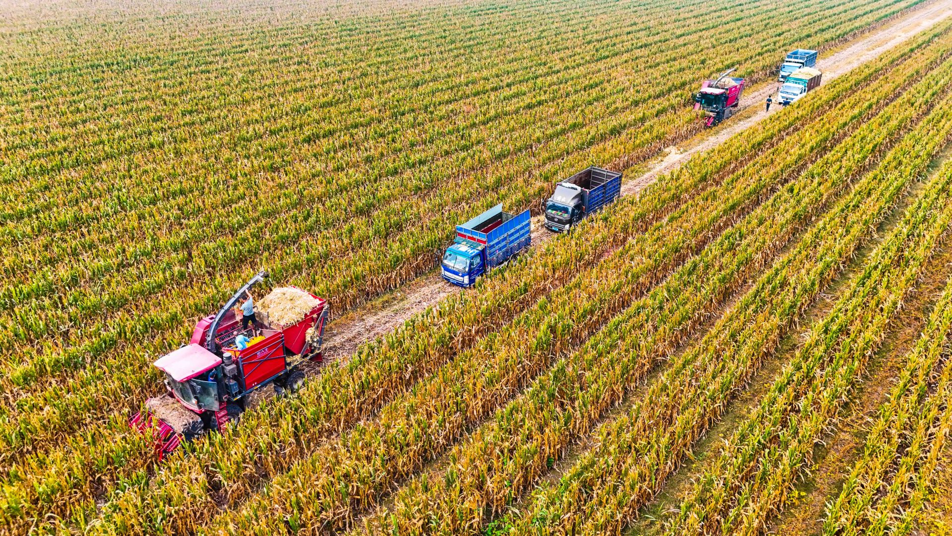 10月17日,乐陵市黄夹镇德鑫生态种植家庭农场大豆玉米带状复合种植地,农场主用大马力收割机在进行玉米机收作业(无人机照片)。