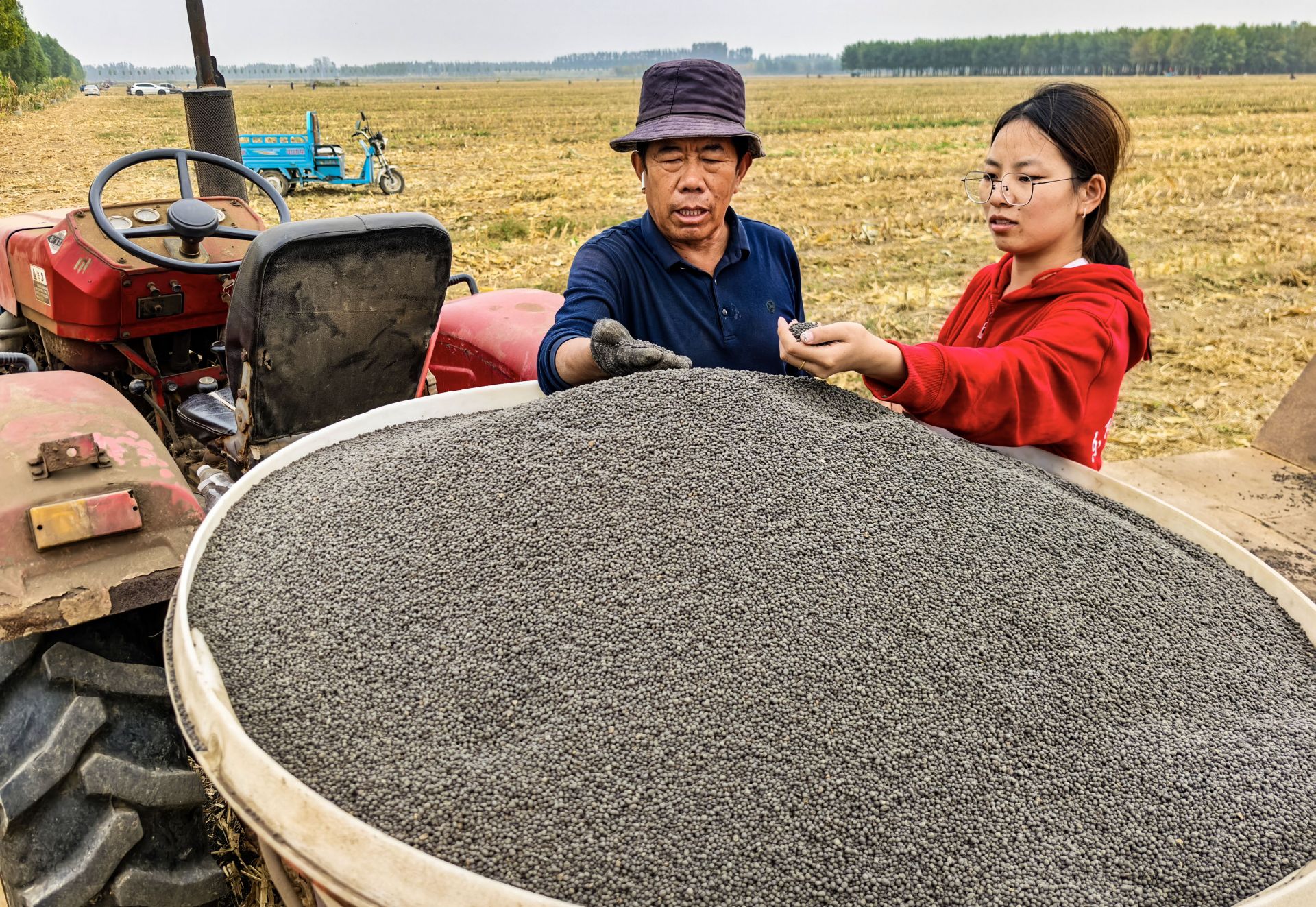 乐陵市王木腿微藻生物肥冬小麦增产提质推广示范区示范区,科技小院研究生在指导种植户进行施肥作业。