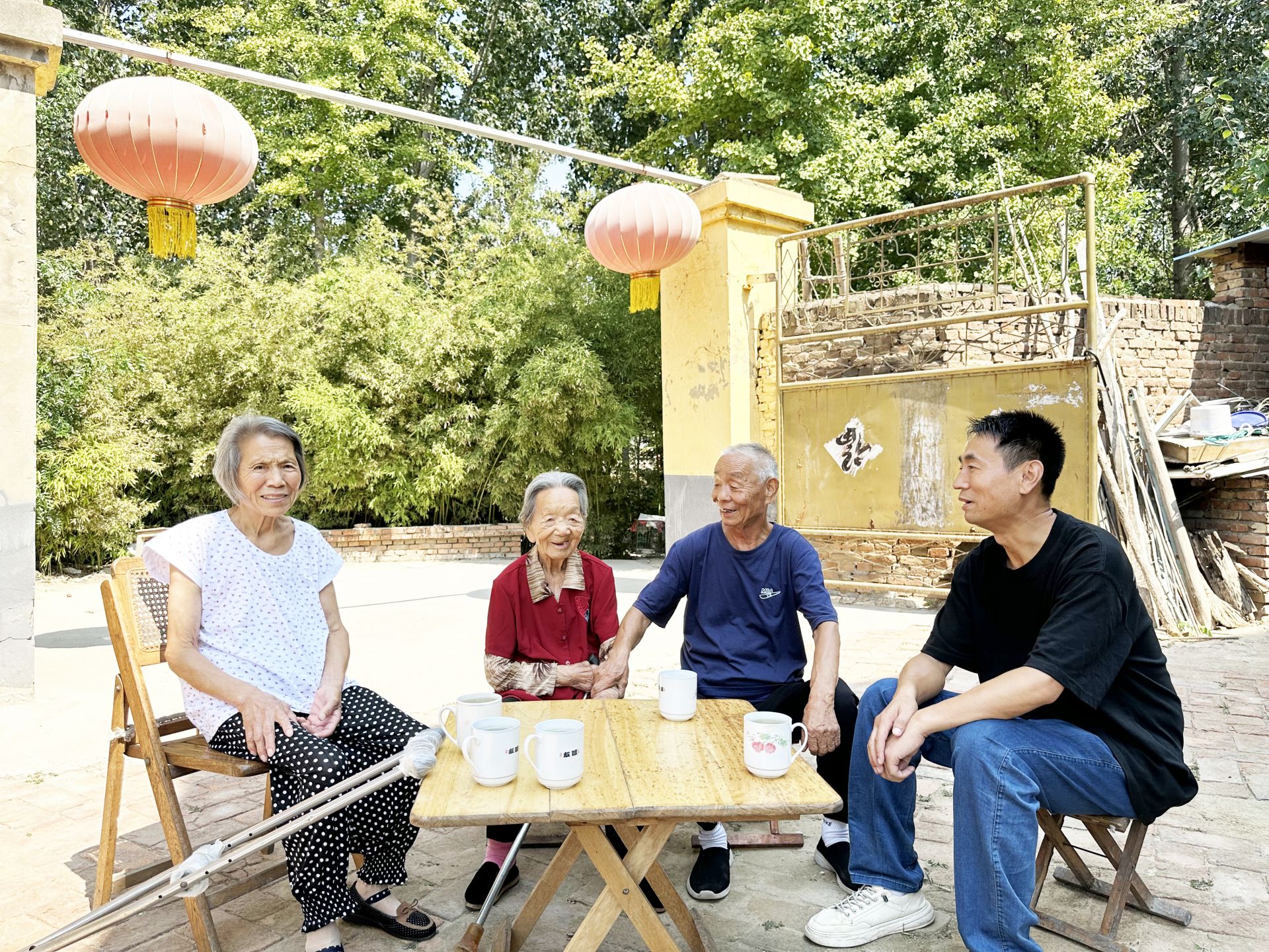 李兆友和妻子、儿子一起陪邢桂兰(左二)聊天喝茶