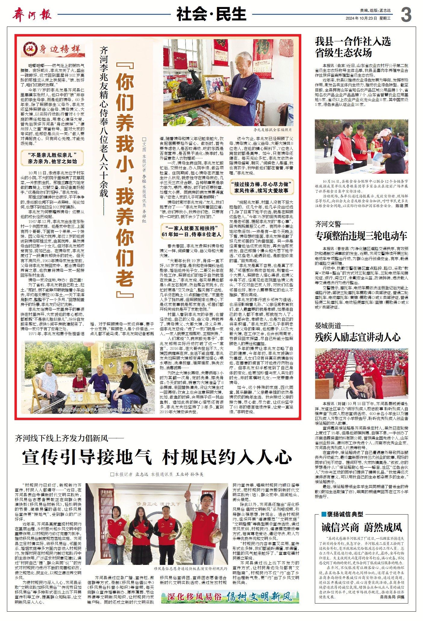 迄今为止,李兆友已经照顾了父母、姨母姨父、岳父岳母、大哥大嫂共8位老人,在他的精心照料下,7位老人离世时都是高寿。如今,只有姨母还健在。每天无论多忙,李兆友依然会陪姨母遛弯、聊天。“伺候老人是福,我也有孩子,我咋做他们都在看着、学着哩。”李兆友说。