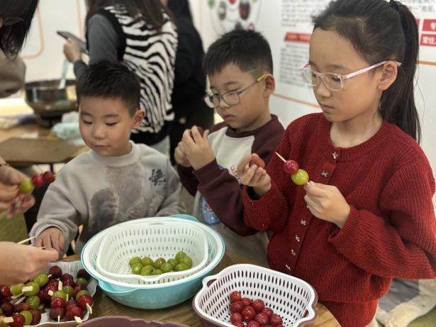 在民间传统区域,工作人员提前备好了新鲜山楂、各类水果,在志愿者的协助下,小朋友们将山楂、水果搭配串好,随后放入糖浆中均匀转动,裹上糖浆,一串串美味的冰糖葫芦便制作完成,孩子们迫不及待地品尝起来。