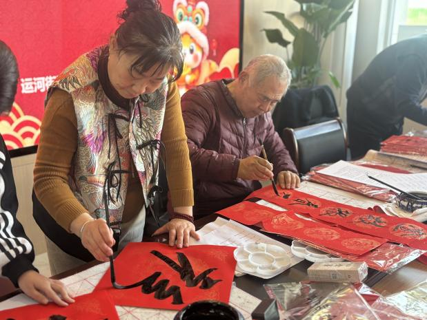 在书法区域,社区邀请了辖区内的王吉利老师和敬轩老师,现场为居民写春联、写福字,一个个饱含深情的“福”字、一副副寓意吉祥的春联在他们笔下一气呵成,现场欢声笑语此起彼伏,浓浓的年味儿在空气中弥漫开来。