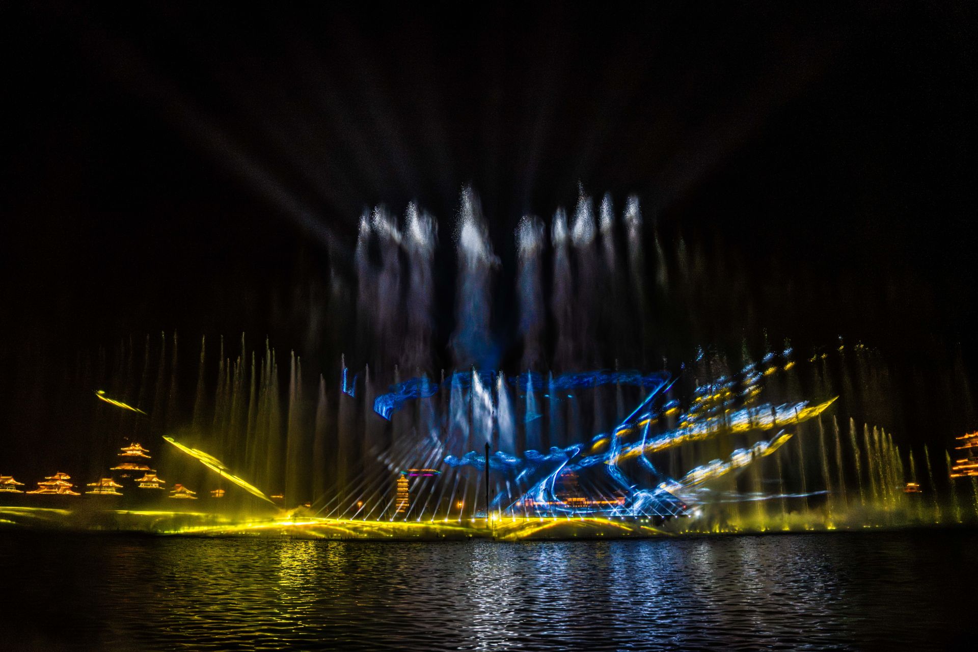 《九曲黄河魂》这场山东省规模最大的沉浸式水秀,则以水域为舞台,180米喷泉水幕为画卷,运用前沿数字技术再现华夏文明的精神图腾。百米水幕间,后羿射日的赤焰金乌轰然坠地,精卫填海的羽翼振翅化沧海为桑田,大禹治水的息壤粒子在头顶流转,虚实相生的光影场景让观众身临天人博弈的恢弘史诗。“我们通过高清晰度的投影设备,将精心制作的图像投射到水幕之上,巧妙利用色彩搭配和光影变化,营造出一种独特的视觉氛围,为游客带来了梦幻般的体验。”刘妍说。