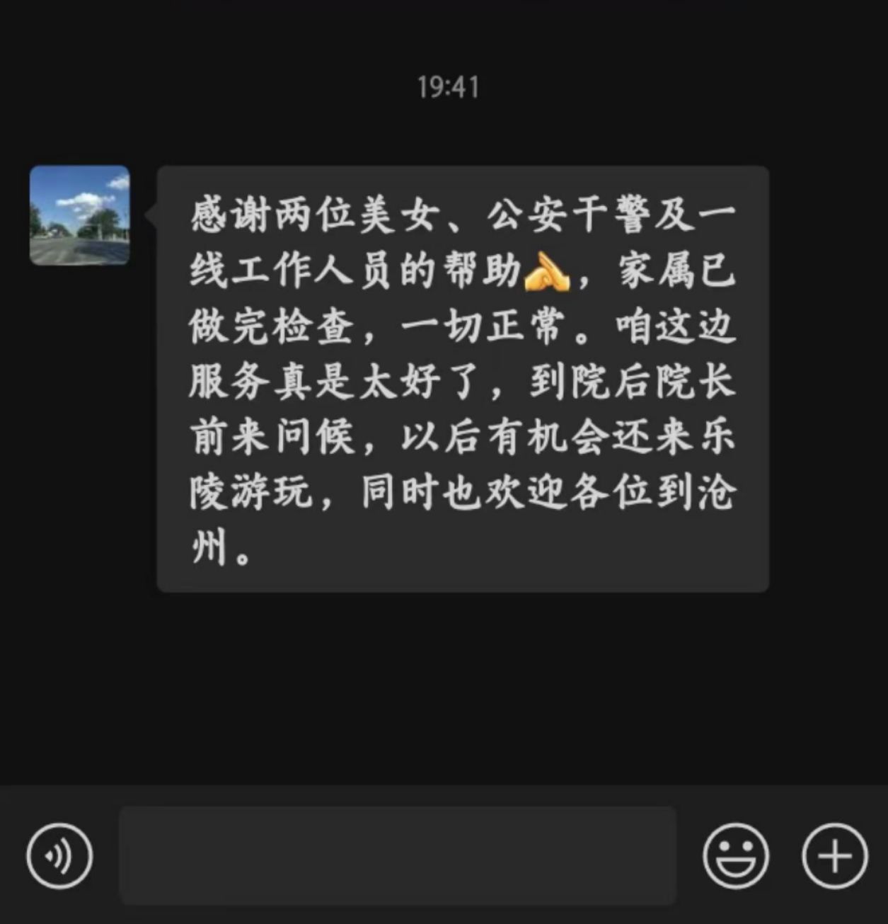 “感谢公安干警、医护人员的帮助,咱这边的服务真是太好了,以后有机会还来乐陵游玩!”5月4日,怀孕5个月的沧州游客武女士在乐陵影视城游玩时,突感下腹剧痛,景区值守的公安干警与医护人员及时赶到,将她护送至乐陵市妇幼保健院诊治。病情平稳返乡后,武女士通过微信表达了感激。