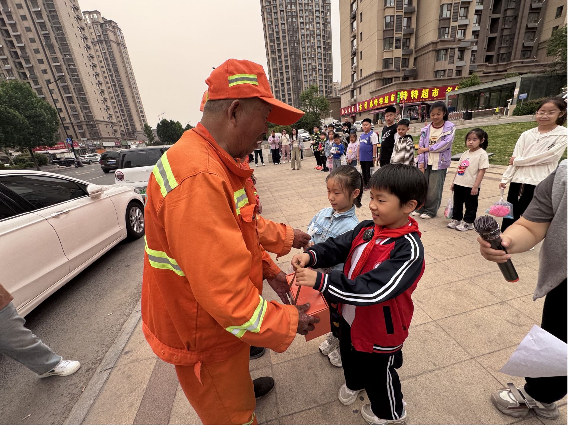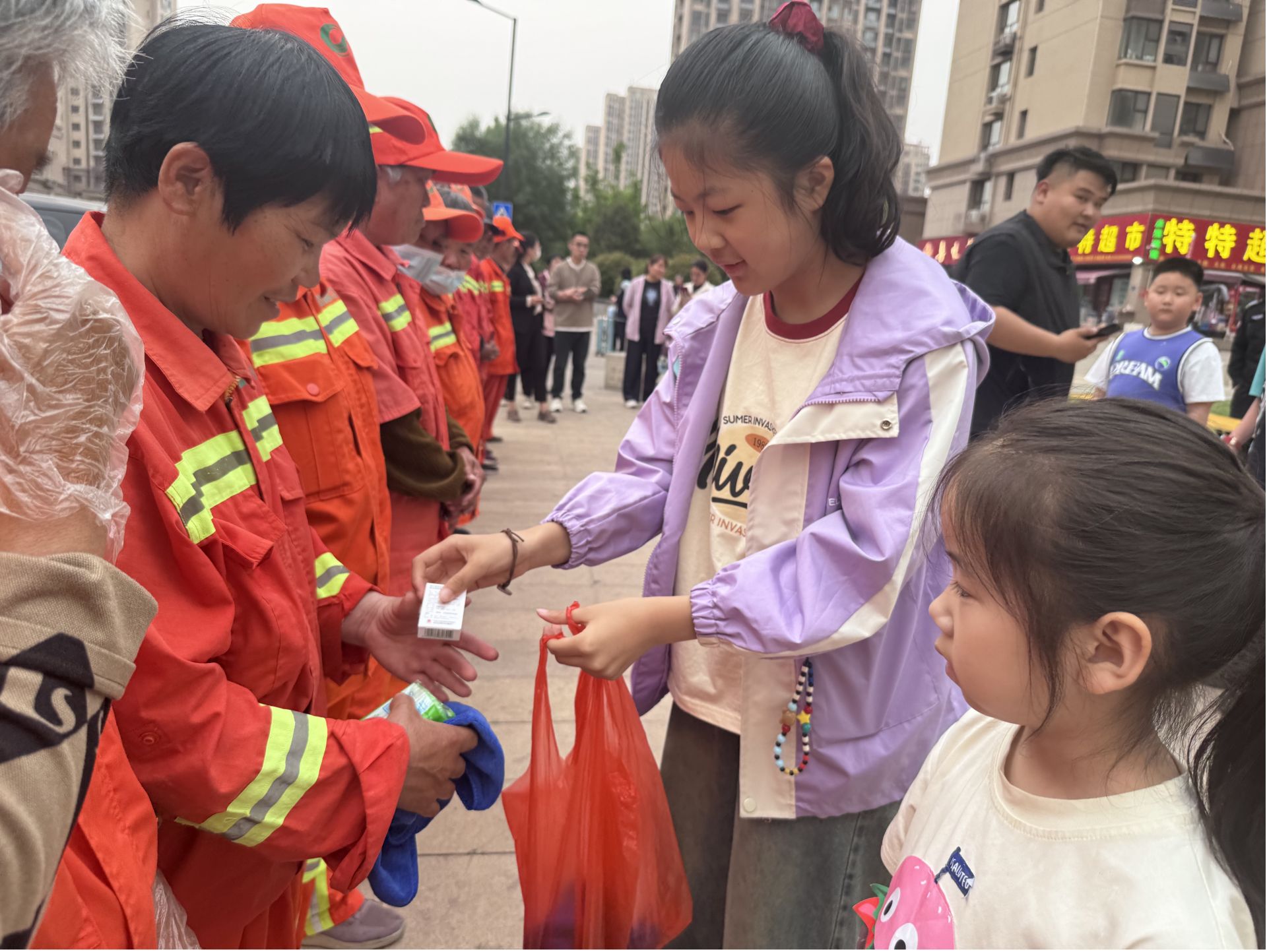 本次活动特别邀请了负责社区周边环卫责任路段的环卫工人,在社区工作人员的带领下,孩子们排成整齐的小队,迎接爷爷奶奶们。一双双小手小心翼翼地将物资递到老人手中,用最清澈的声音说道,“爷爷奶奶,你们辛苦了!”“爷爷奶奶,这是我们用零花钱买的小礼物,谢谢你们每天把城市打扫得干干净净!”同时,永嘉社区联合“红色合伙人”齐河口腔医院也为环卫工人们送上了免费的牙膏牙刷等口腔护理用品。稚嫩的敬意与质朴的感恩交织在一起,为街头增添了一抹最温暖的色彩。