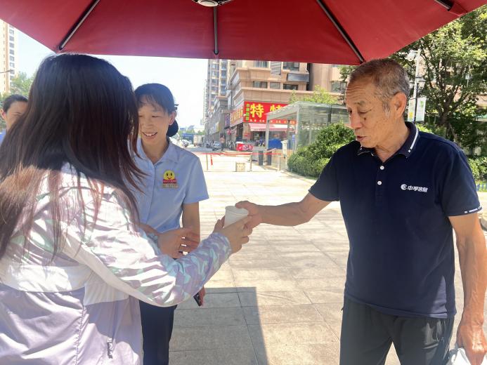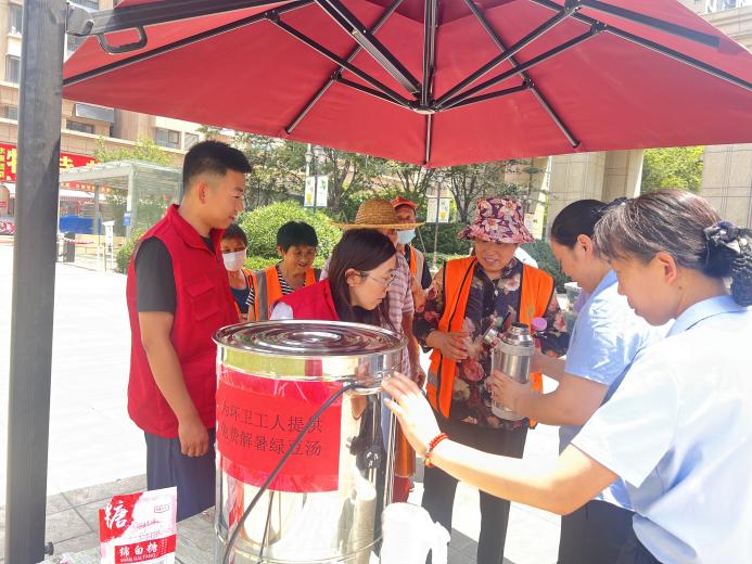 在阳光一品小区西门,社区工作者和物业工作人员热情邀请环卫工人们和来往居民来一杯清甜解暑的绿豆汤,尝尝这份夏日里的清爽滋味。“天这么热,能喝上一碗绿豆汤,真是太舒服了!” 刚领到绿豆汤的张阿姨一边喝着,一边高兴地说。