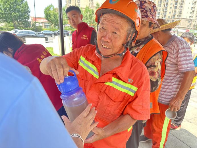 对于在烈日下坚守岗位的环卫工人来说,这碗绿豆汤更是“及时雨”。他们每天穿梭在大街小巷,顶着高温清扫路面,汗水早已湿透了衣衫。当接过工作人员递来的绿豆汤时,他们的脸上露出了朴实的笑容。“谢谢社区和物业的关心,这碗汤喝下去,心里都凉快多了!” 环卫工人李师傅感动地说。