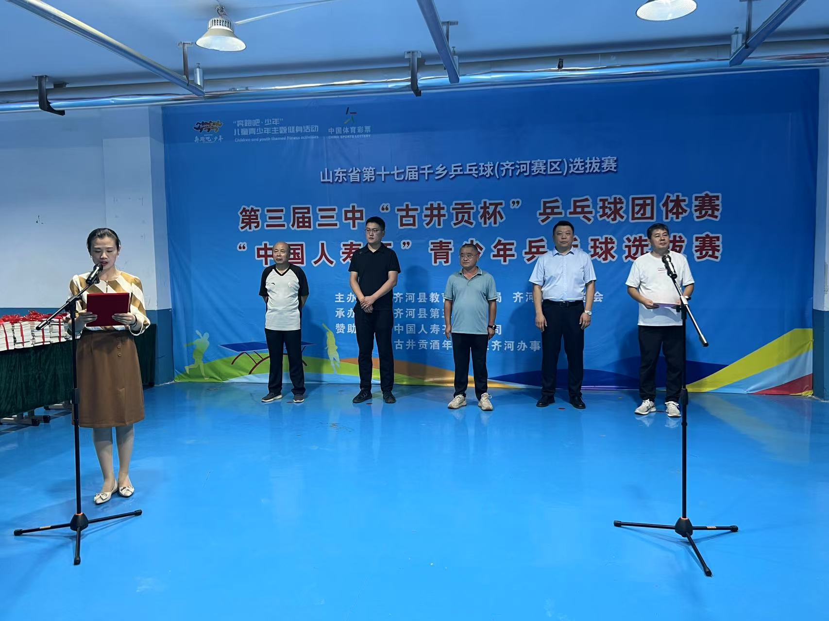 7月12—15日,由齐河县教育和体育局、齐河县体育总会主办,齐河县第三中学协办的第十七届千乡乒乓球(齐河赛区)选拔赛暨第三届齐河三中“古井贡杯”乒乓球团体赛、“中国人寿杯”青少年乒乓球选拔赛在第三中学海洋球馆上演精彩对决。有来自齐河及周边县区20余所中小学147名青少年及44支社会代表队180余人齐聚一堂,在为期4天的比赛中展开激烈的角逐。本届比赛是齐河三中连续第三次承办,也是首次吸引其它县市区球队参加的比赛。