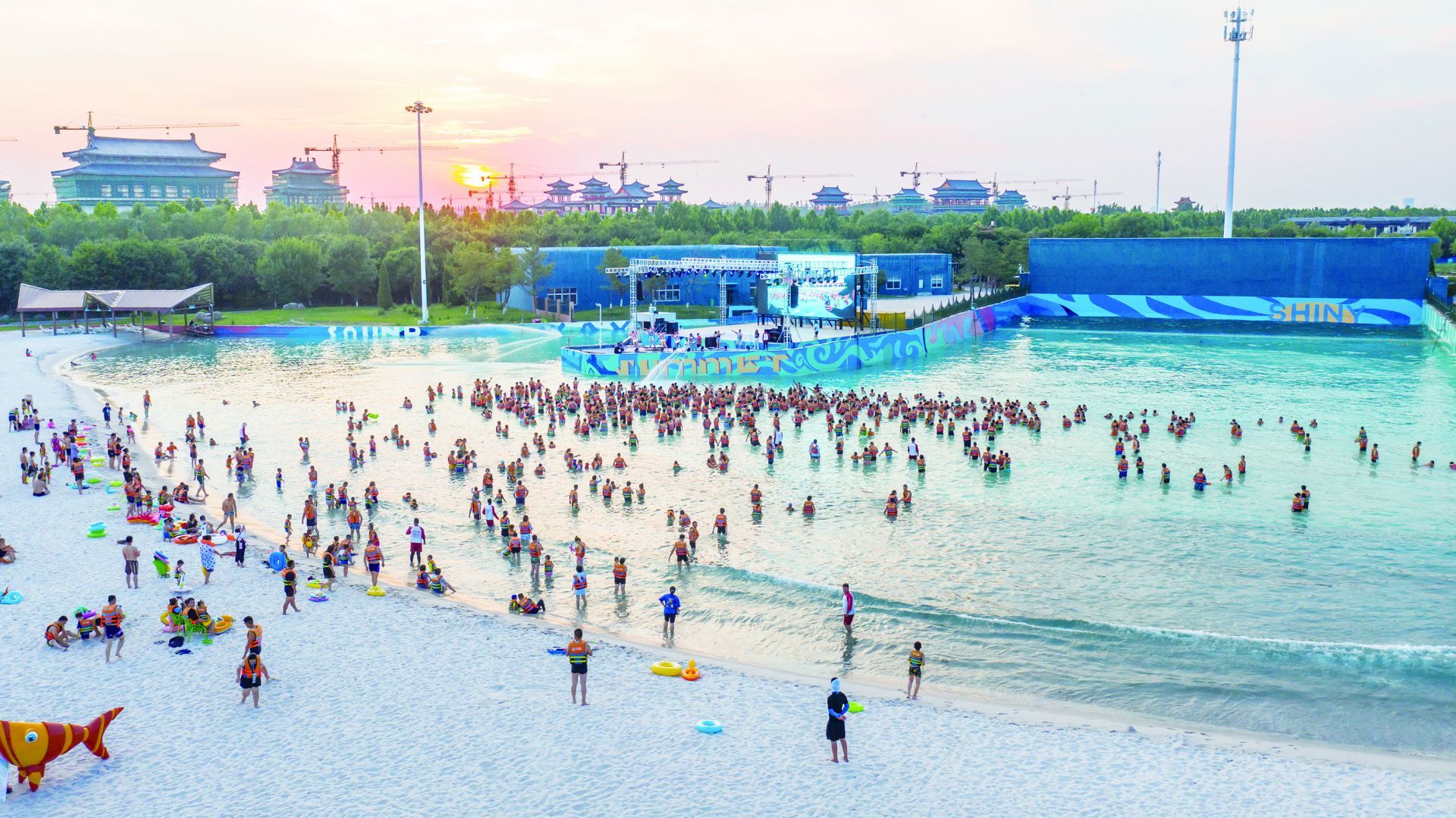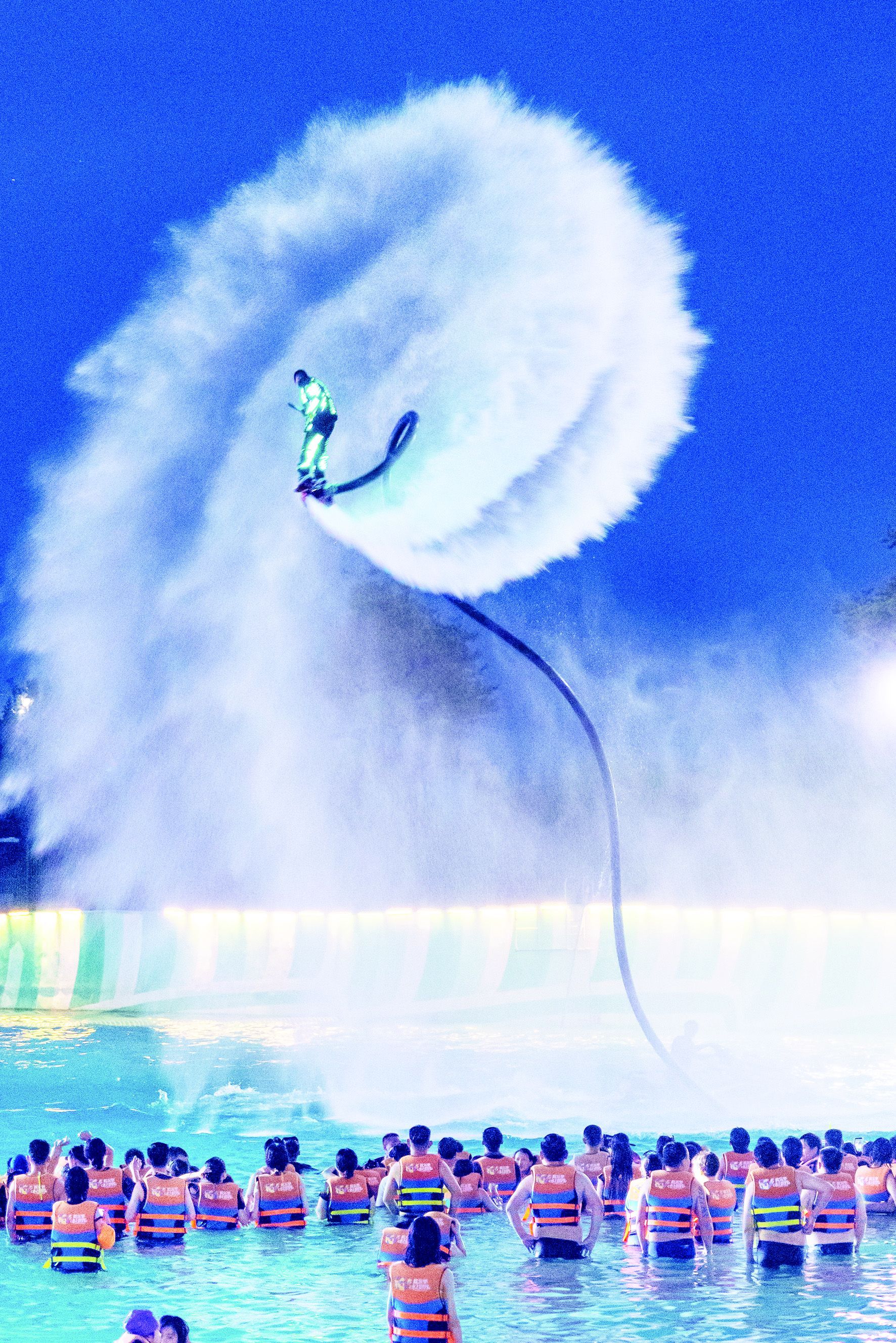 在泉城欧乐堡水上世界,夜场的开启为夏日文旅注入了更多激情。夜幕降临,万人造浪池变身光影与音乐的海洋,“水上飞人”特技表演中,特效灯光与冲天水柱交织,将现场气氛推向高潮。“刷到抖音就带着孩子来了,一小时四十分钟的车程很值,玩得太开心了。”来自河北衡水的游客栾乐乐表示。除了刺激的水上项目,沙滩游戏、特色美食摊位等配套服务,满足了亲子家庭、年轻群体等不同客群的需求。据泉城欧乐堡水上世界常务副总经理徐世杰介绍,夜场从下午4点持续至晚上9点,专业救生团队全程值守,让游客在欢乐中倍感安心。
