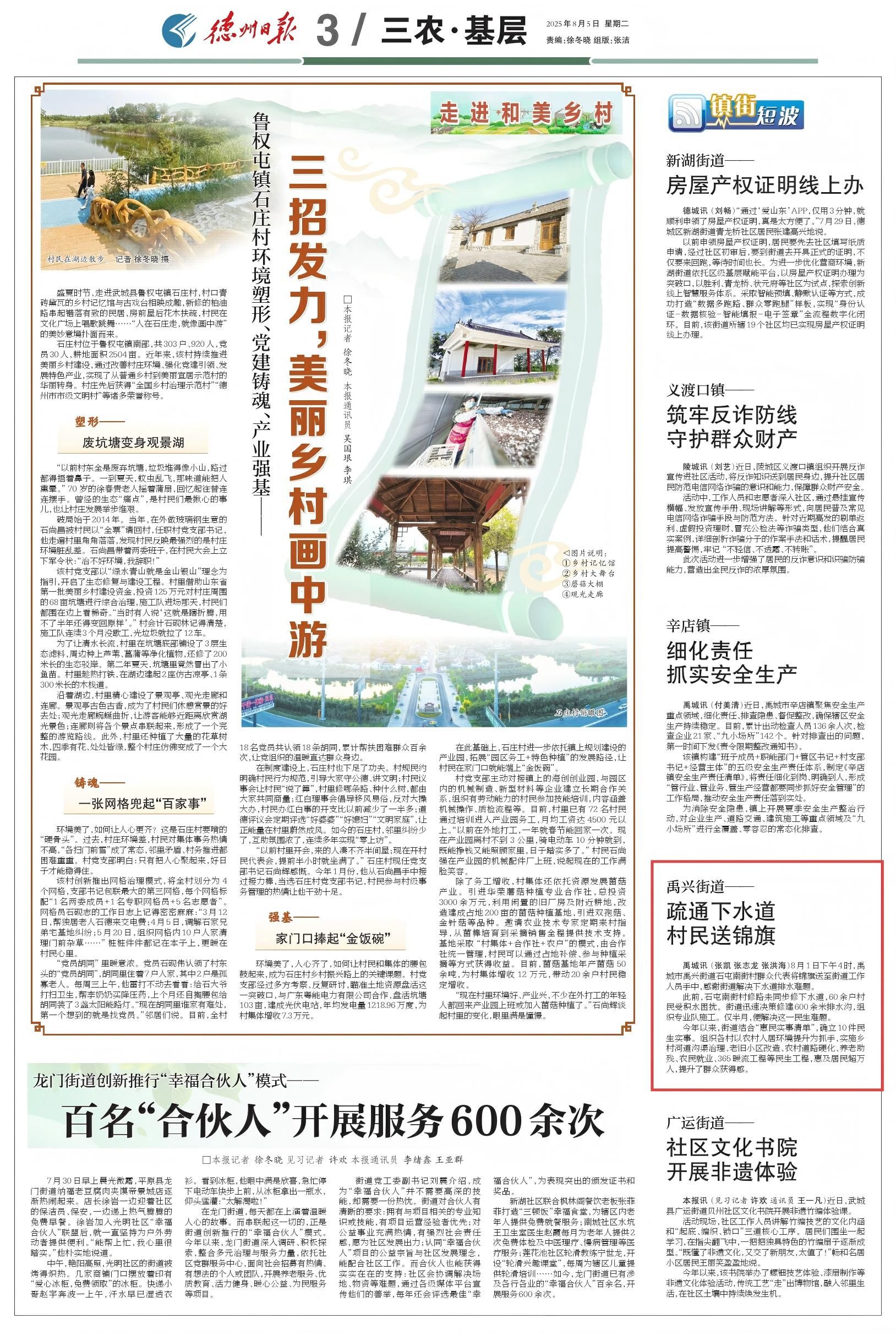 今年以来,街道结合“惠民实事清单”,确立10件民生实事。组织各村以农村人居环境提升为抓手,实施乡村河道沟渠治理、老旧小区改造、农村道路硬化、养老助残、农民就业、365暖流工程等民生工程,惠及居民超万人,提升了群众获得感。
