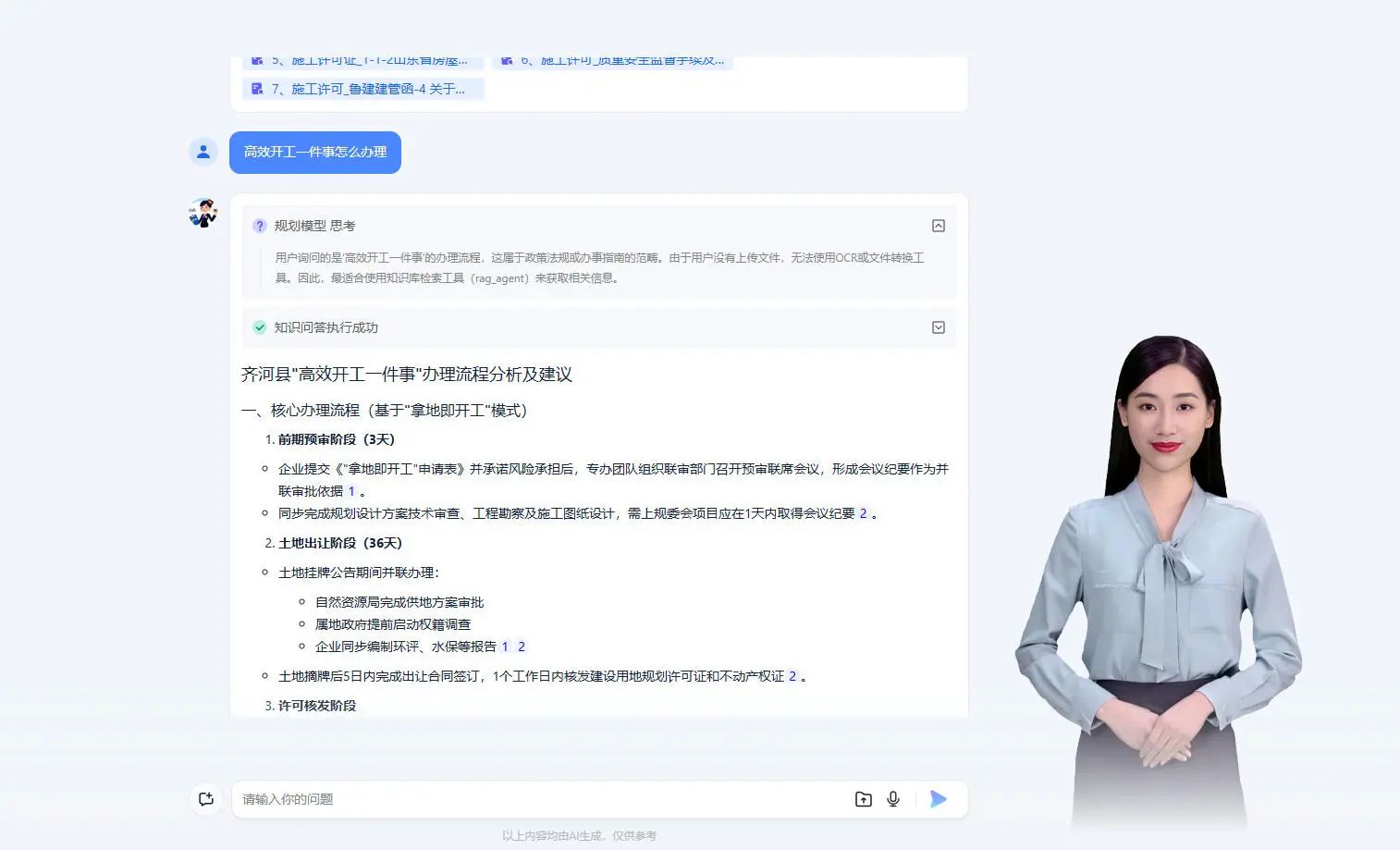 探索运用AI大模型辅助审批。依托Deepseek等AI大语言模型,全面梳理工程建设项目开工前高频事项涉及的法律法规,探索建立涵盖政策法规、业务流程、审查要点等内容的AI大模型辅助审批系统,推动惠企政策精准推送、办事流程“即问即答”,并为项目审批提供政策分析和法律风险提醒,进一步提升服务精准性和用户体验,为高效开工提供政策支持。