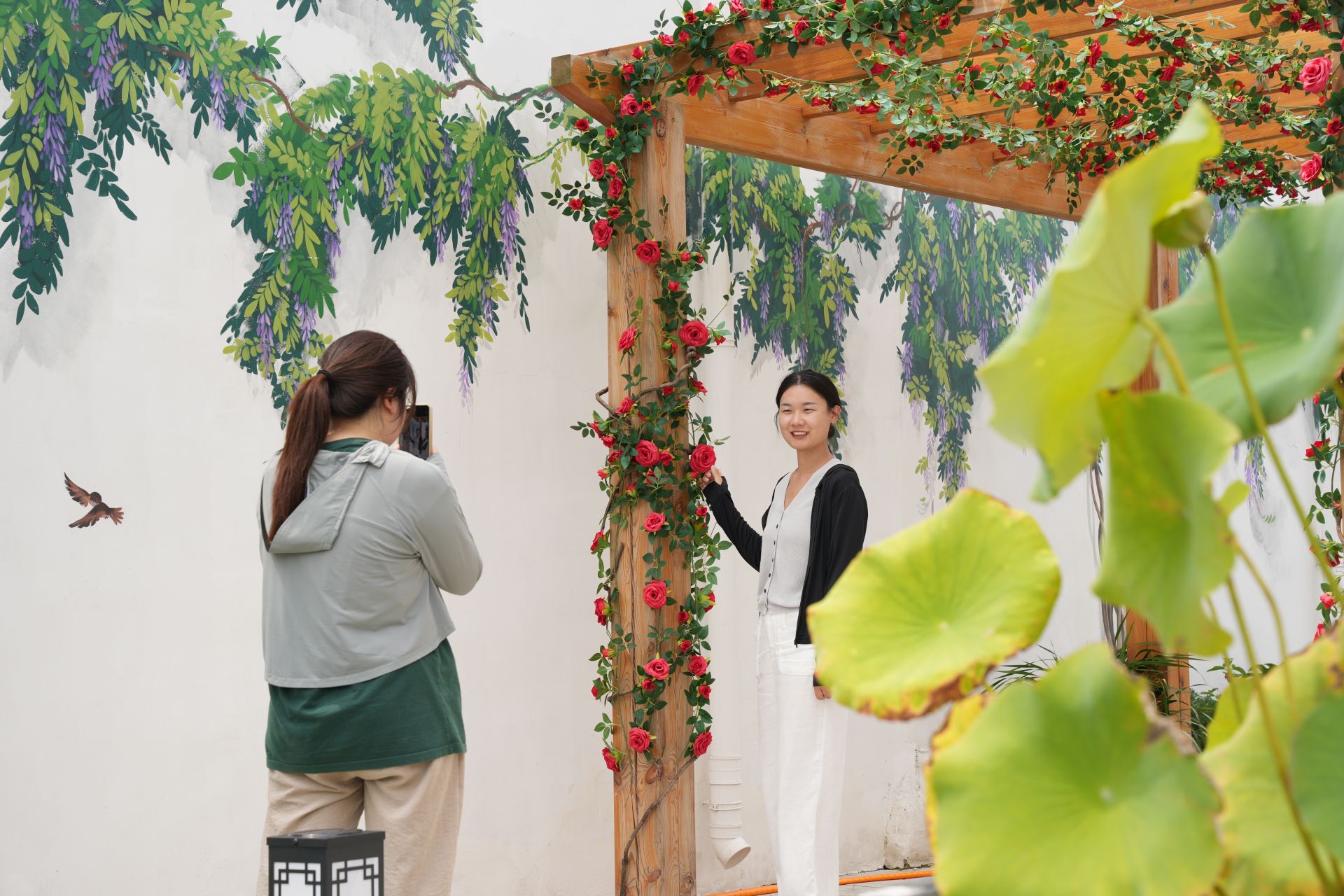 走进潘庄村的河畔白云间民宿区,一排中式古典建筑映入眼帘。庭院古朴典雅,水墨墙画与院内的荷花绿景相得益彰,透着浓郁的文化气息。庭院深处还设了充气泳池,方便游客带着孩子尽情享受亲子时光。步入套房,木雕窗棂与精美家具相映成趣,游客张加凝和家人围坐品茶闲聊:“住这儿像穿越回古代,还能体验黄河文化,心里特别舒坦。”