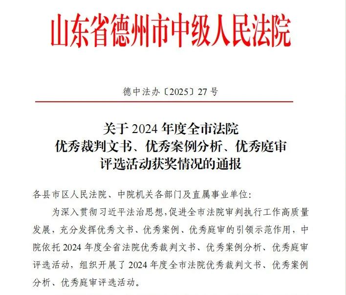 近日,德州市中级人民法院下发《关于2024年度全市法院优秀裁判文书、优秀案例分析、优秀庭审评选活动情况的通报》。其中,宁津法院4篇裁判文书、1篇案例分析、1场庭审获奖。