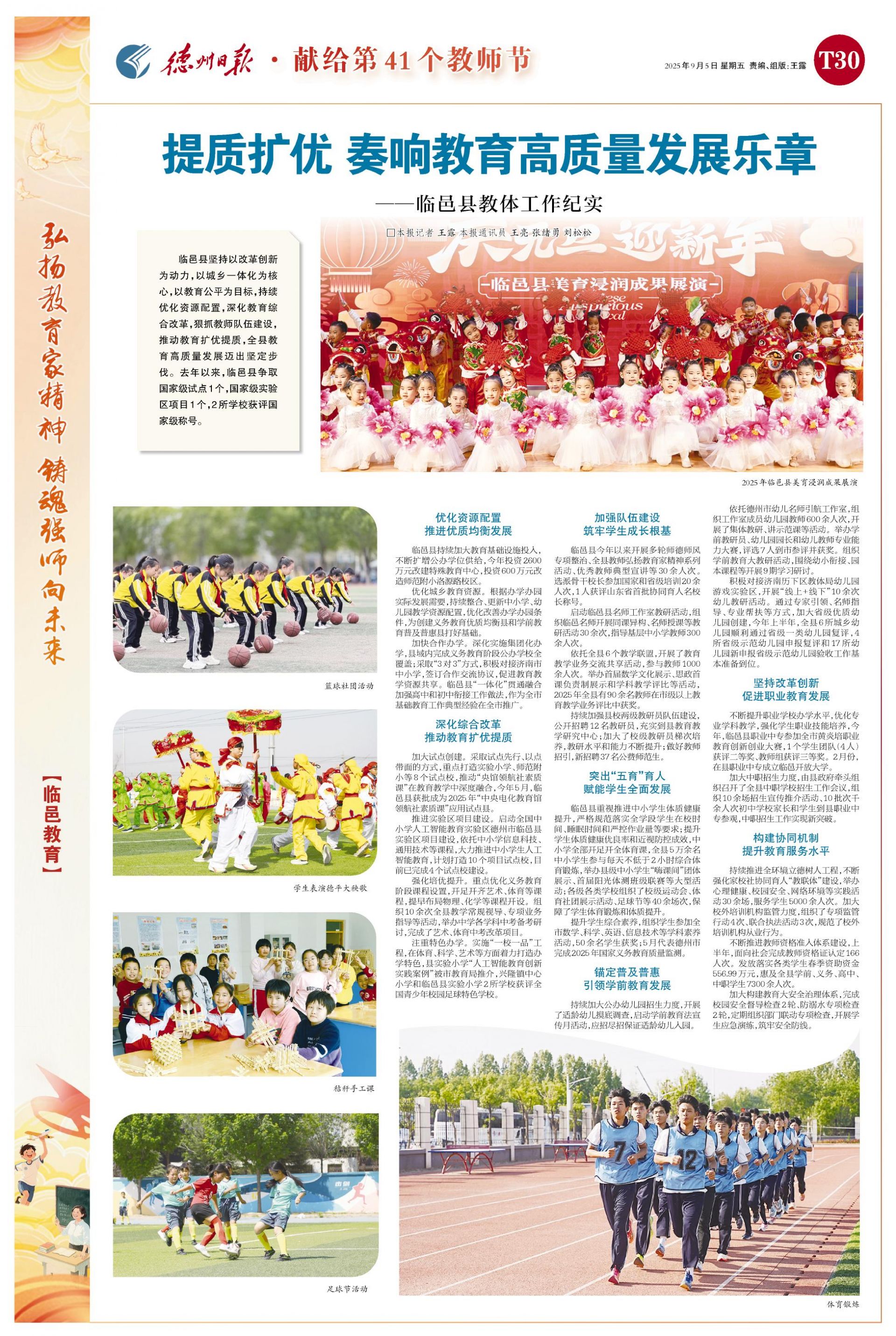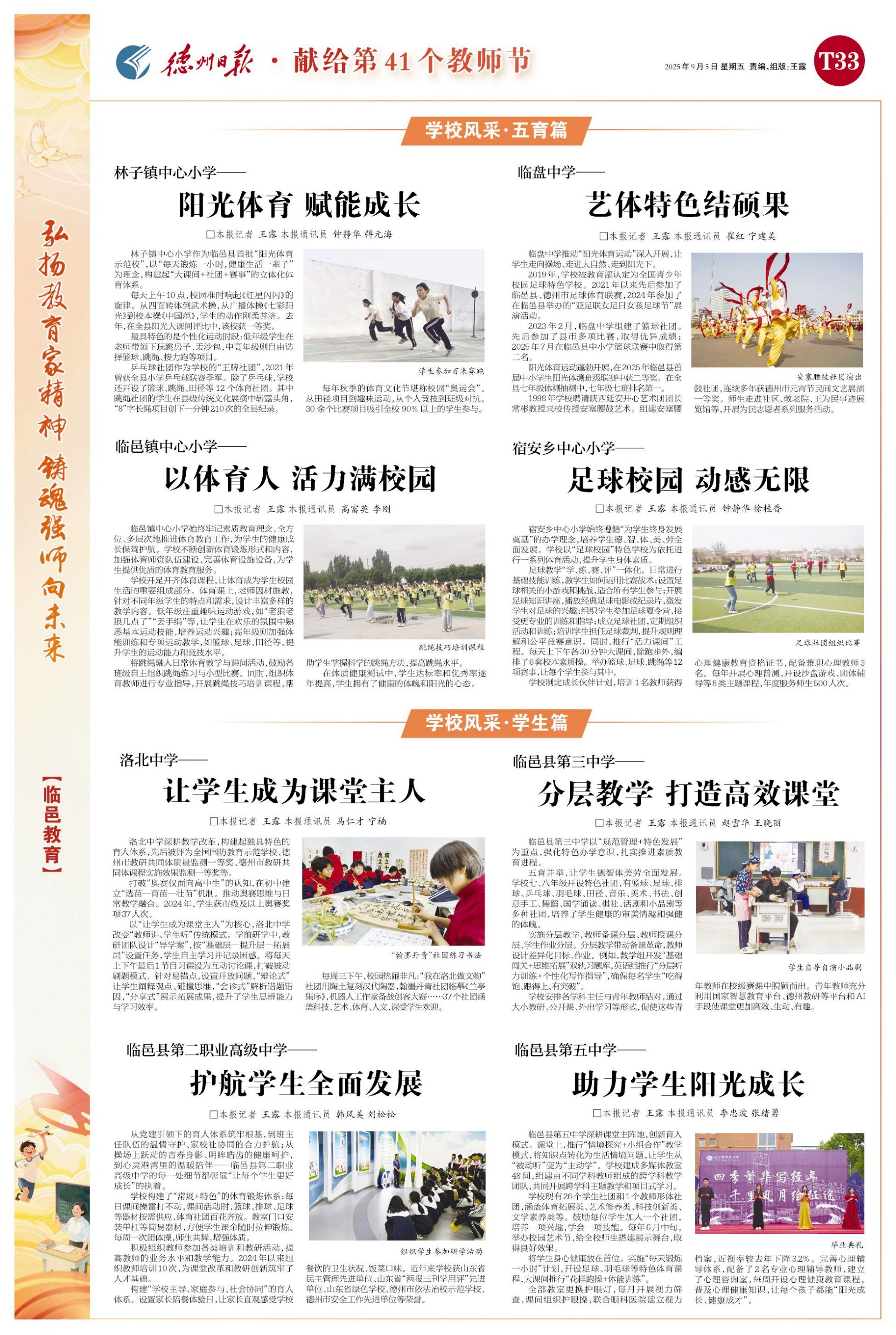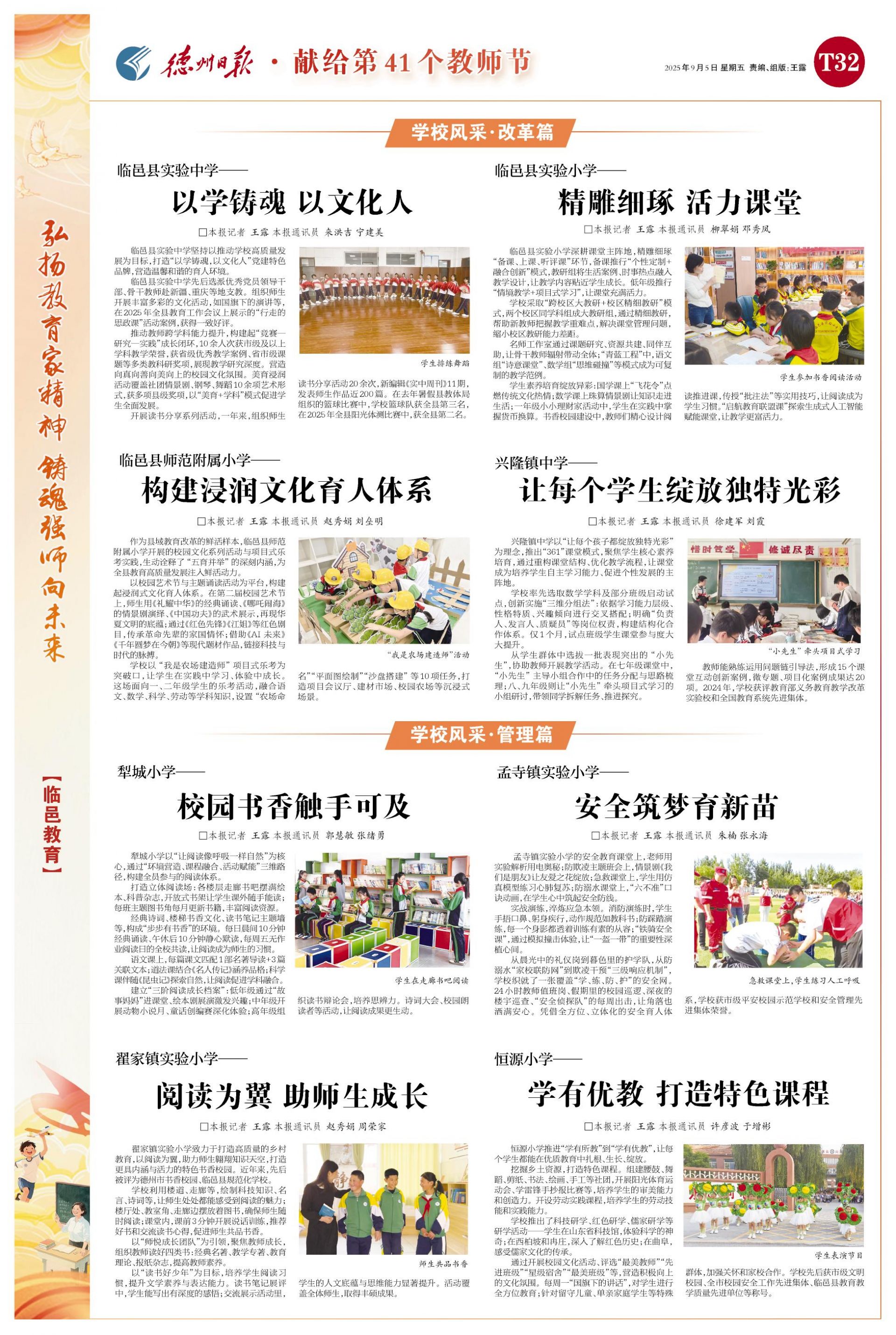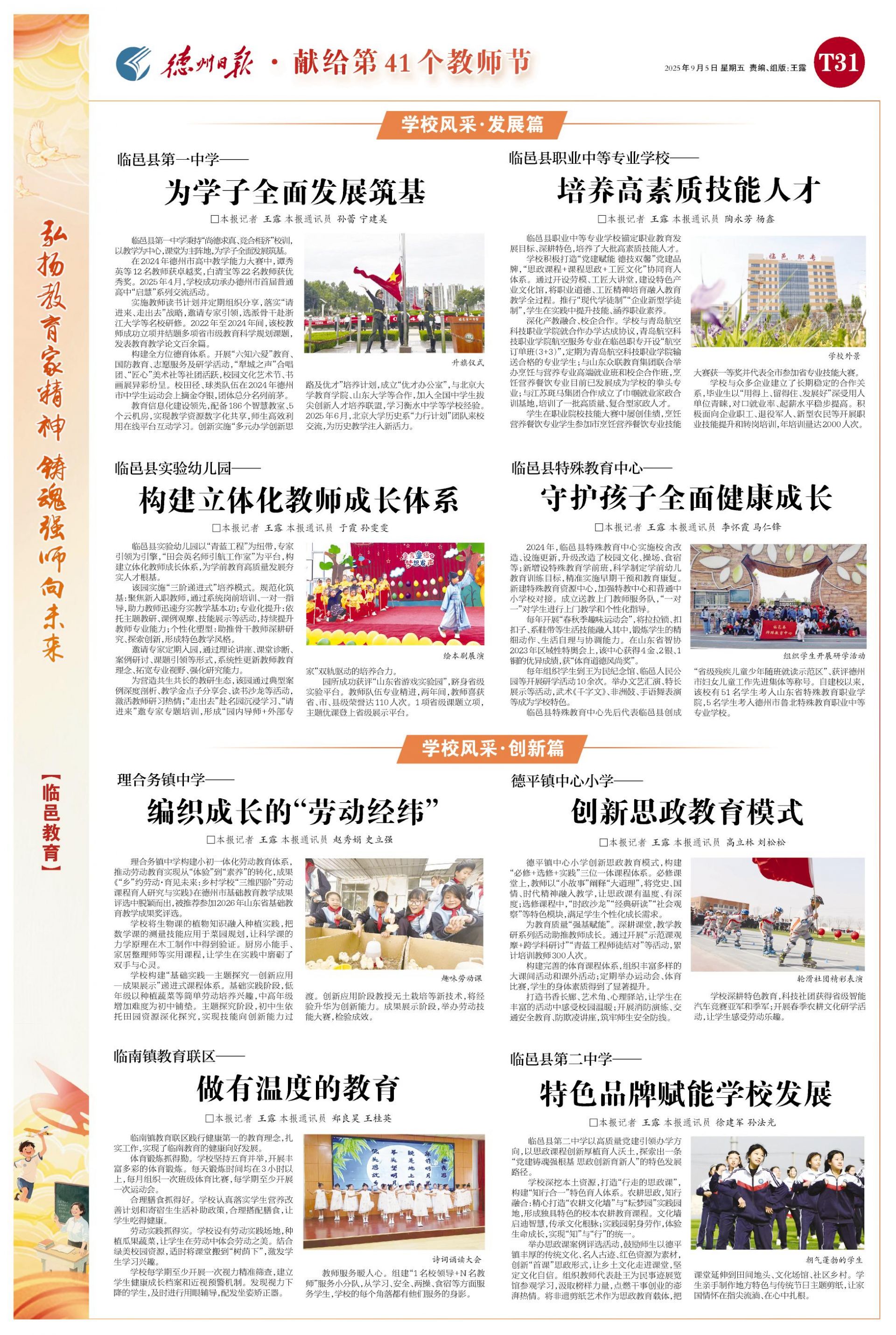 临邑县今年以来开展多轮师德师风专项整治、全县教师弘扬教育家精神系列活动、优秀教师典型宣讲等30余人次。选派骨干校长参加国家和省级培训20余人次,1人获评山东省首批协同育人名校长称号。