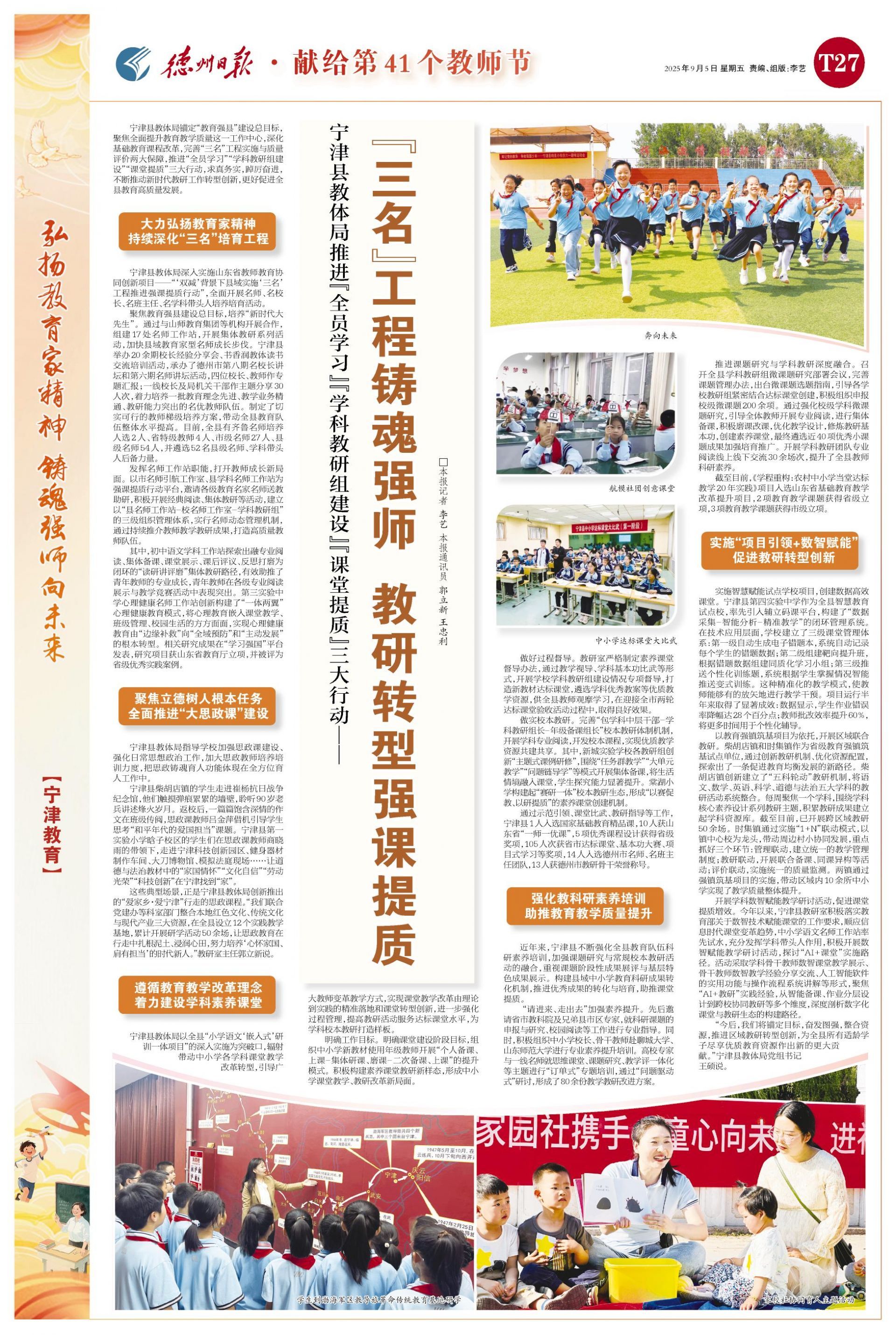 深化思政育人。扎实推进中小学思政课一体化建设,深度挖掘本地红色文化、传统文化、先进文化资源,与德百杂技蟋蟀谷、山东渤海军区教导旅革命传统教育基地等单位合作,精心打造“红色记忆”“非遗传承”“承智未来”三条精品研学路线。举办“童心向党”非遗传承等主题活动140余场次,构建起课内课外、校内校外有机衔接的思政育人网络。2025年全市中小学党组织领导的校长负责制和思政工作会议、德州市研学实践工作培训会议相继在宁津县召开,“行走的思政课”已成为宁津思政教育创新的闪亮名片。