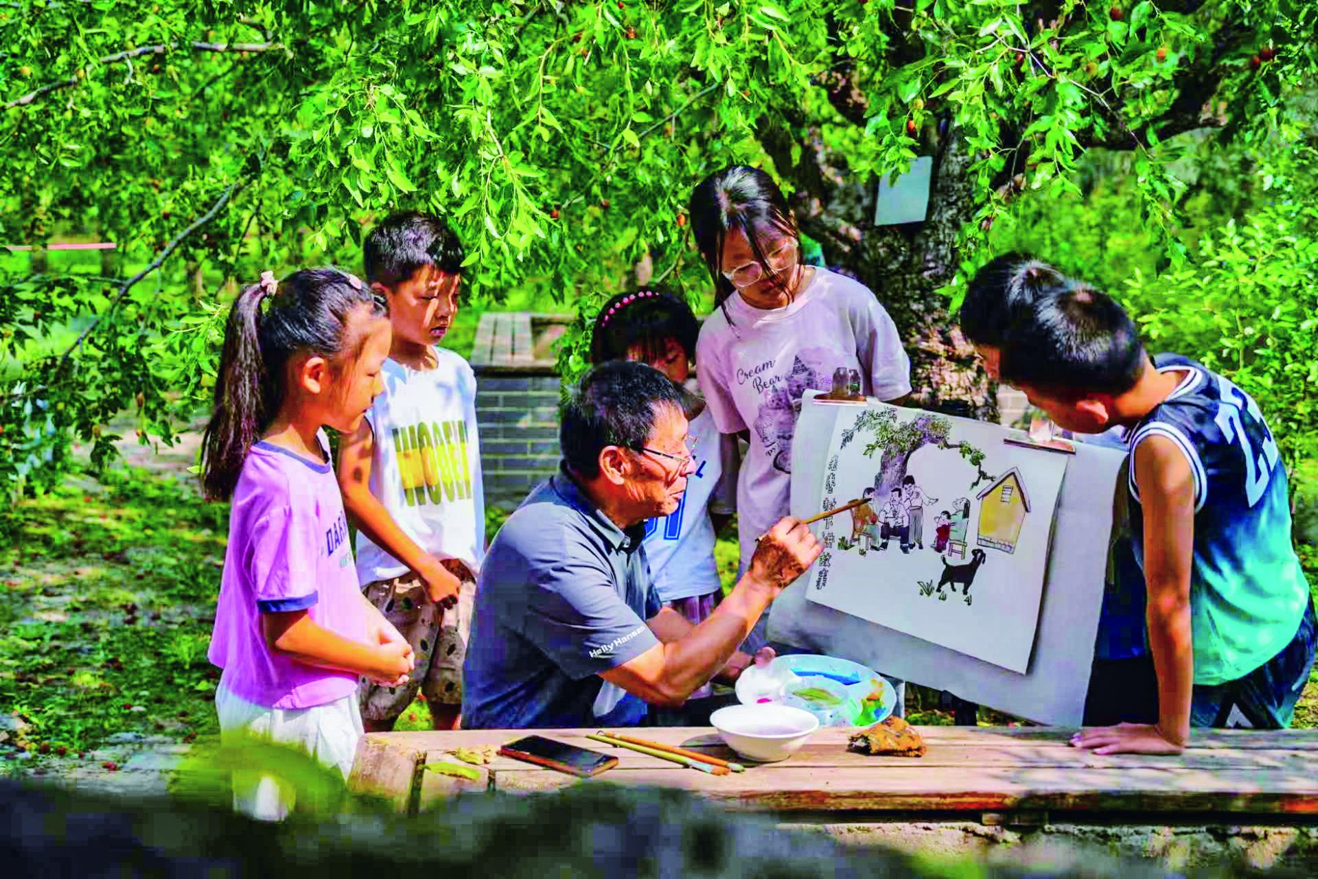 农民画家在老枣树下教孩子们画农民画。贾鹏摄