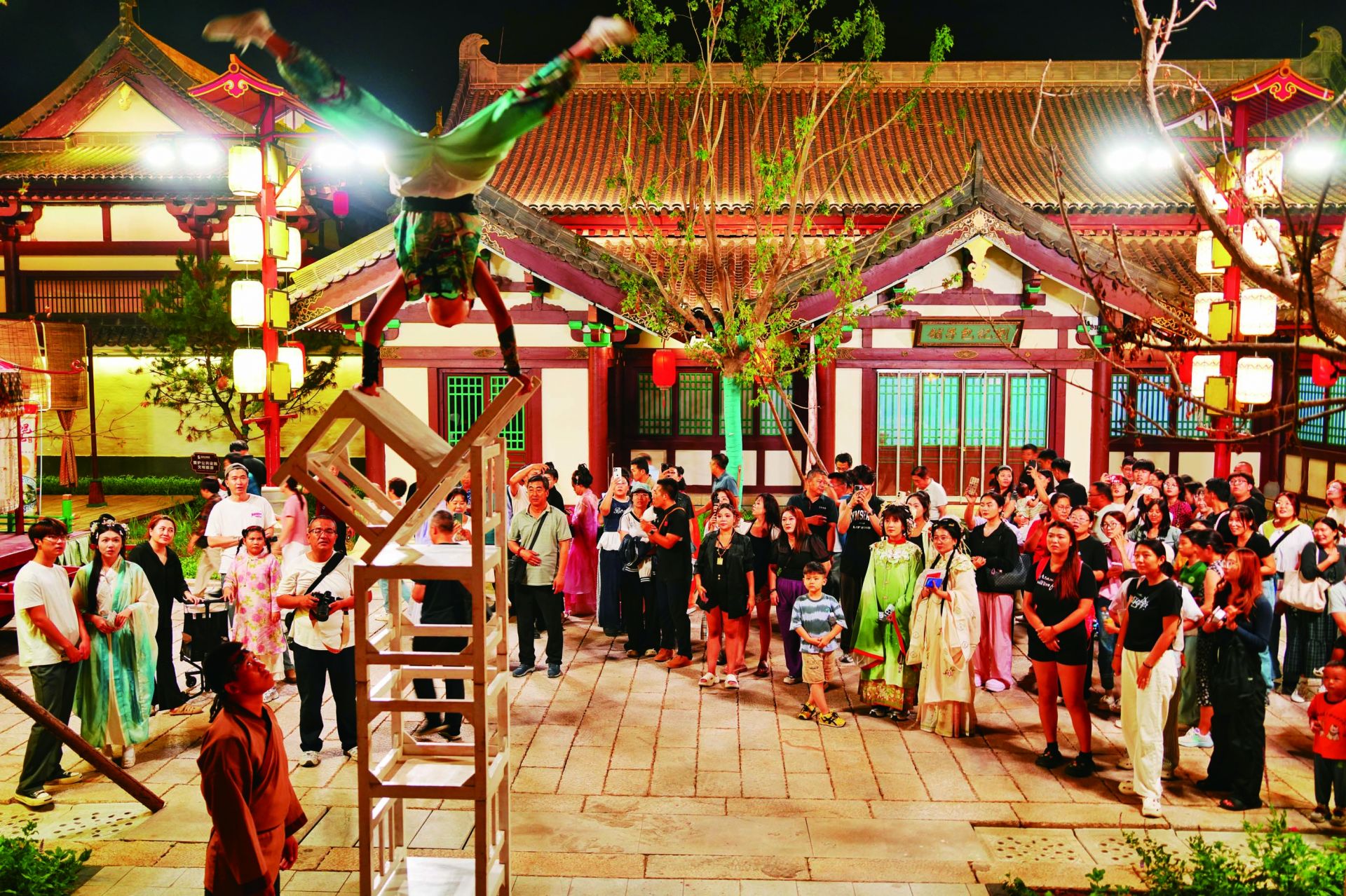 乐陵影视城精彩的演出吸引众多游客驻足观看。贾鹏 摄
