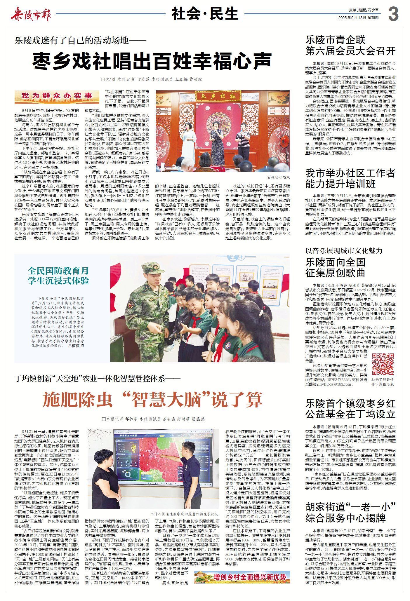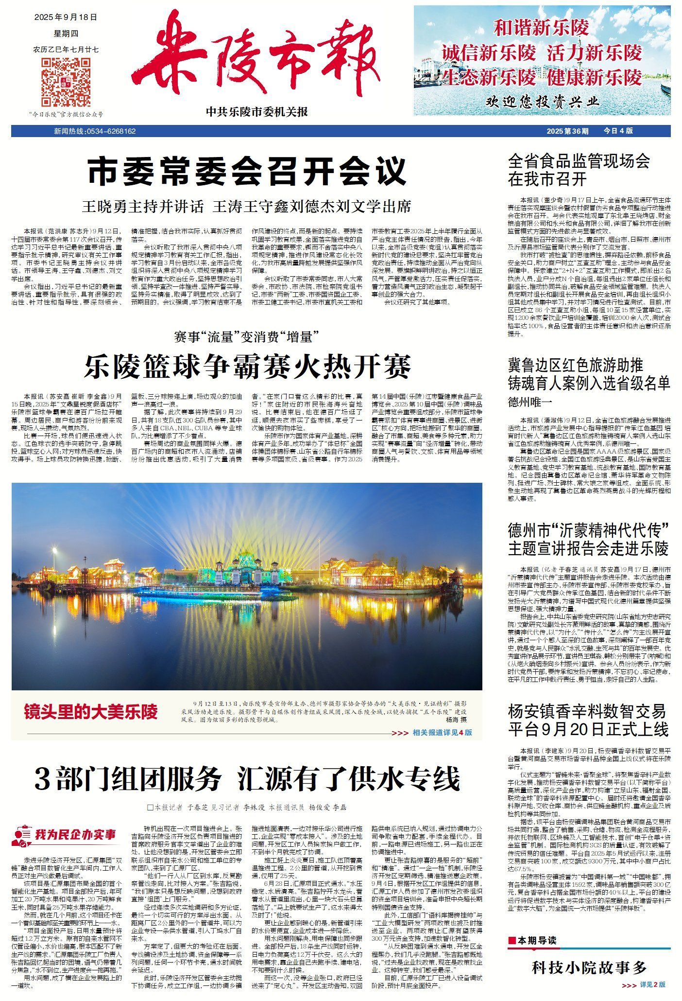 乐陵市新闻周报(9月12日至9月18日) ©原创 2025-09-18 07:34 0 ▶看球赛逛商圈,乐陵市篮球争霸赛开赛(点击查看详情) ▶我为民企办实事 | 乐陵三部门组团上门服务,汇源公司有了供水专线(点击查看详情) ▶乐陵:科技小院故事多(点击查看详情) ▶乐陵:“枣乡戏社”唱出百姓精气神(点击查看详情) ▶乐陵丁坞镇创新“天空地”农业一体化智慧管控体系,施肥除虫“智慧大脑”说了算(点击查看详情) ▶看,镜头里的大美乐陵!(点击查看详情) 德州日报新媒体出品编辑|于春芝审核|胥爱珍 终审|尹滨