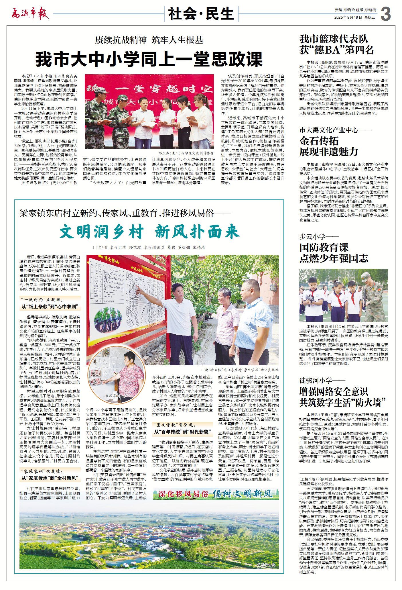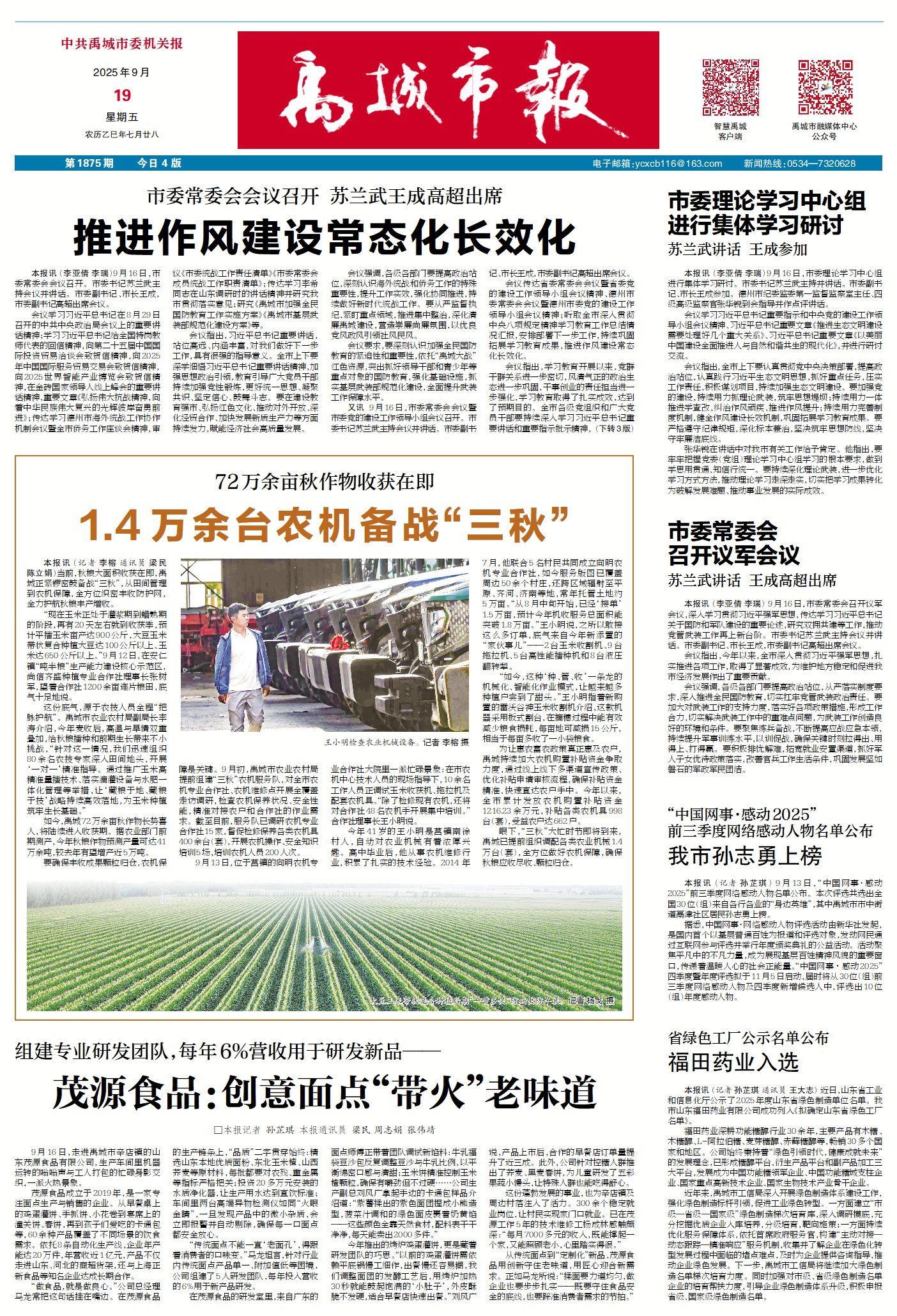 禹城市新闻周报(9月13日至9月19日) ©原创 2025-09-19 14:58 德州日报 0 ▶禹城1.4万余台农机备战“三秋” | 72万余亩秋作物收获在即。(查看详情) ▶禹城茂源食品:创意面点“带火”老味道 !(查看详情) ▶走在前 挑大梁 高质量发展一线行 | 禹城:竞逐工业母机新赛道。(查看详情) ▶赓续抗战精神 筑牢人生根基 | 禹城市大中小学同上一堂思政课。(查看详情) ▶禹城市梁家镇东店村:文明润乡村 新风扑面来。(查看详情) ▶文化 | 家乡那条河。(外五篇·首) 德州日报新媒体出品编辑|李晓楠审核|李榕 终审|尹滨 (作者:德州日报)