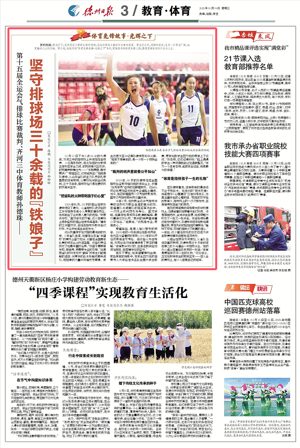 从烟台姑娘到齐河媳妇,从省队名将到基层教师,孙德珠用三十多年时间在第二故乡浇灌出一片排球沃土。她的办公桌上压着自己手写的一句话:“体育是要陪伴孩子一生的礼物。”这份信念,正如她教导学生时那般坚定——在人生的赛场上,每个人都是自己的冠军。