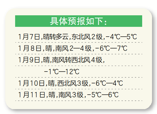 预计本周我县天气整体以晴好为主,仅1月7日有短暂多云,无明显降水过程,天气条件总体利于市民出行、户外晾晒等活动。气温波动较为明显,1月7日至8日气温相对平稳;1月9日气温攀升,最高气温可达12℃,暖意明显;1月10日气温回落,最高气温降至4℃,最低气温维持在-6℃至-4℃之间。风力整体温和,无明显大风影响。