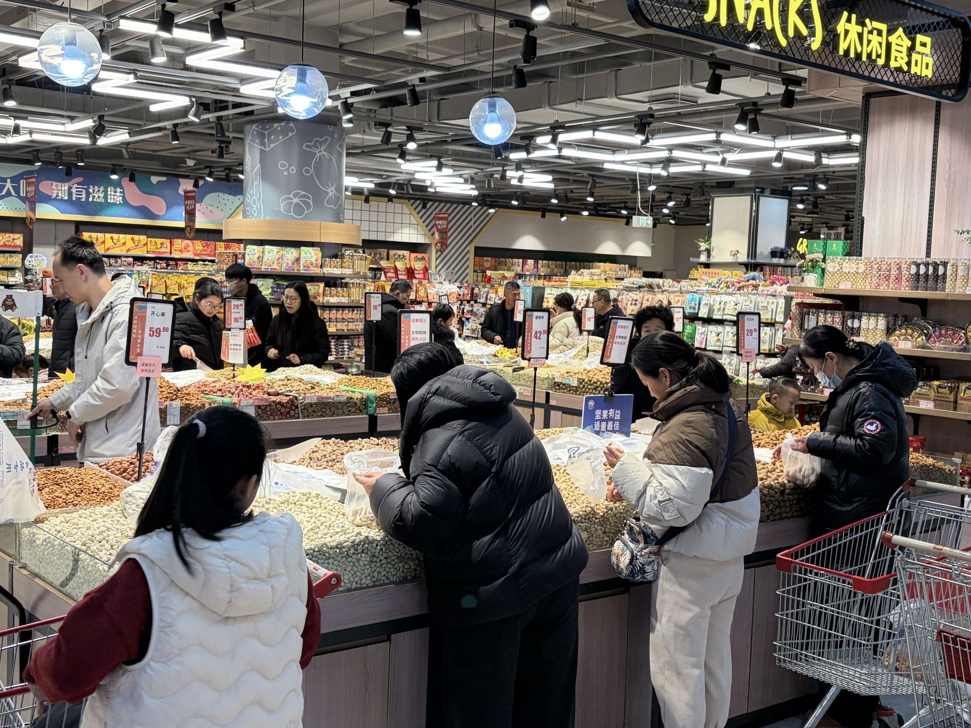 节日期间,我市各大商场、超市和商业街纷纷推出“满赠满减”“限时折扣”“品牌特展”等促消费活动,聚焦“年货”“年味”“年俗”主题,集中展销各类农副产品、老字号产品、年味工艺品及春节用品,既丰富了节日市场供给,也营造出浓厚的新春氛围,实现客流与营业额双增长。与此同时,全市生活必需品市场运行平稳,供应充足。大中型超市及农贸市场库存保持高位,仅金秤·农批城日均供应量达400吨,有效保障了节日期间市民的“菜篮子”和“米袋子”需求。“春节期间我来了好几次商场,除了购物,还和家人朋友聚餐,气氛很热闹,年味特别足。”市民王飞飞表示。
