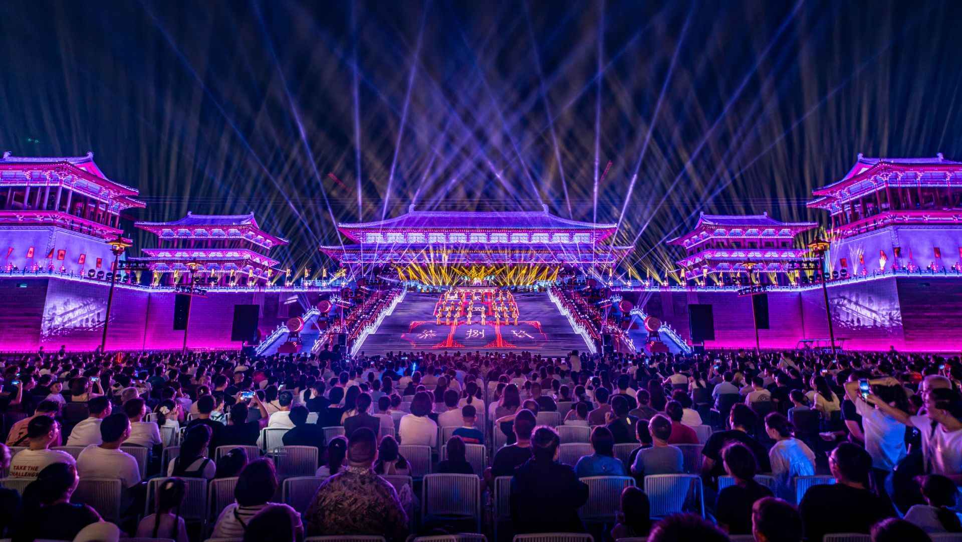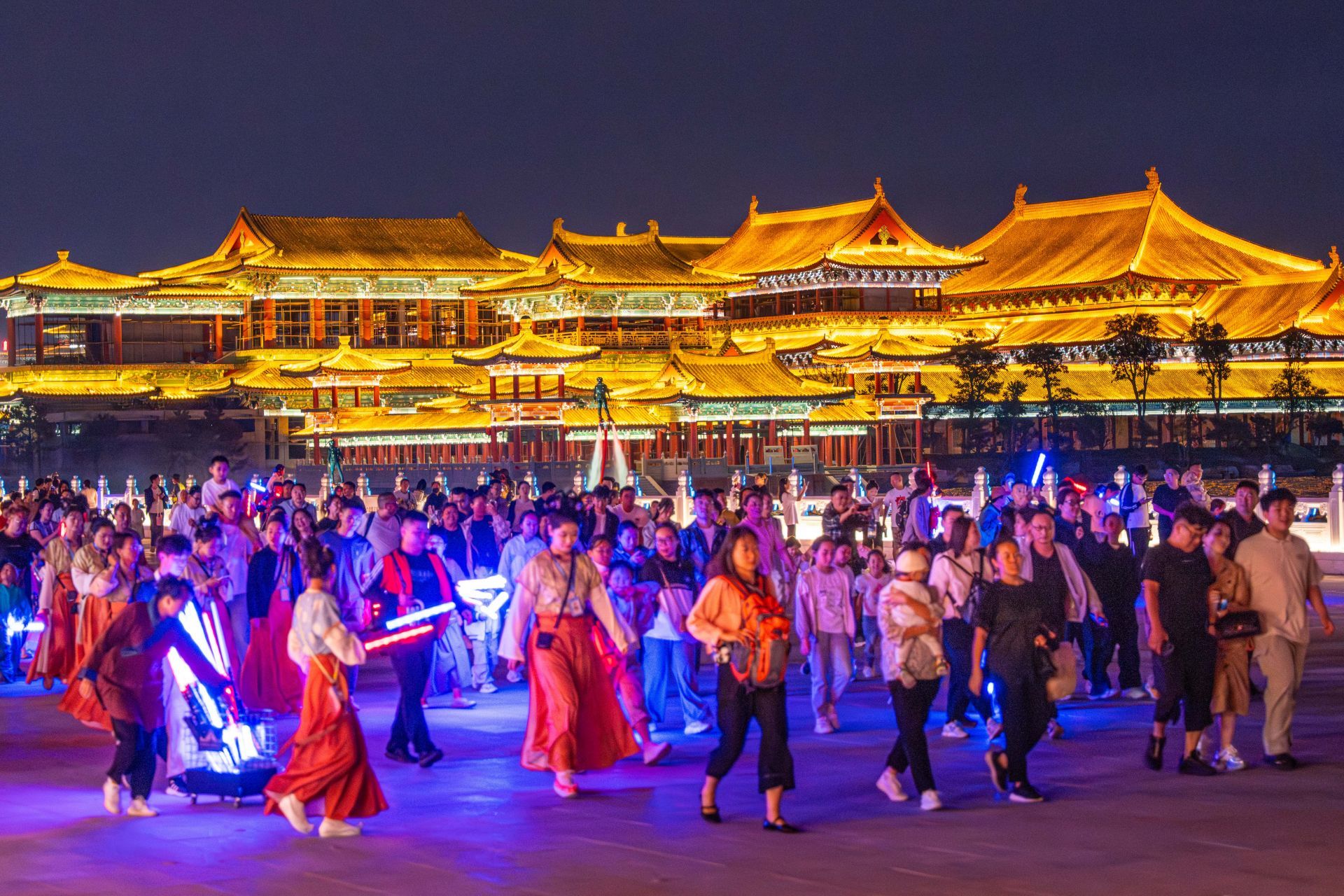 走出剧院,好戏仍在继续。广场上锣鼓喧天,鼓乐花车队热情迎客。游客们一路跟随,走入中国古典建筑群,大型户外演艺《盛世朝元》和水影秀《九曲黄河魂》接连上演。沉浸于泰山封禅和祭黄大典的恢宏仪式,游客们仿佛穿越到盛唐时代。