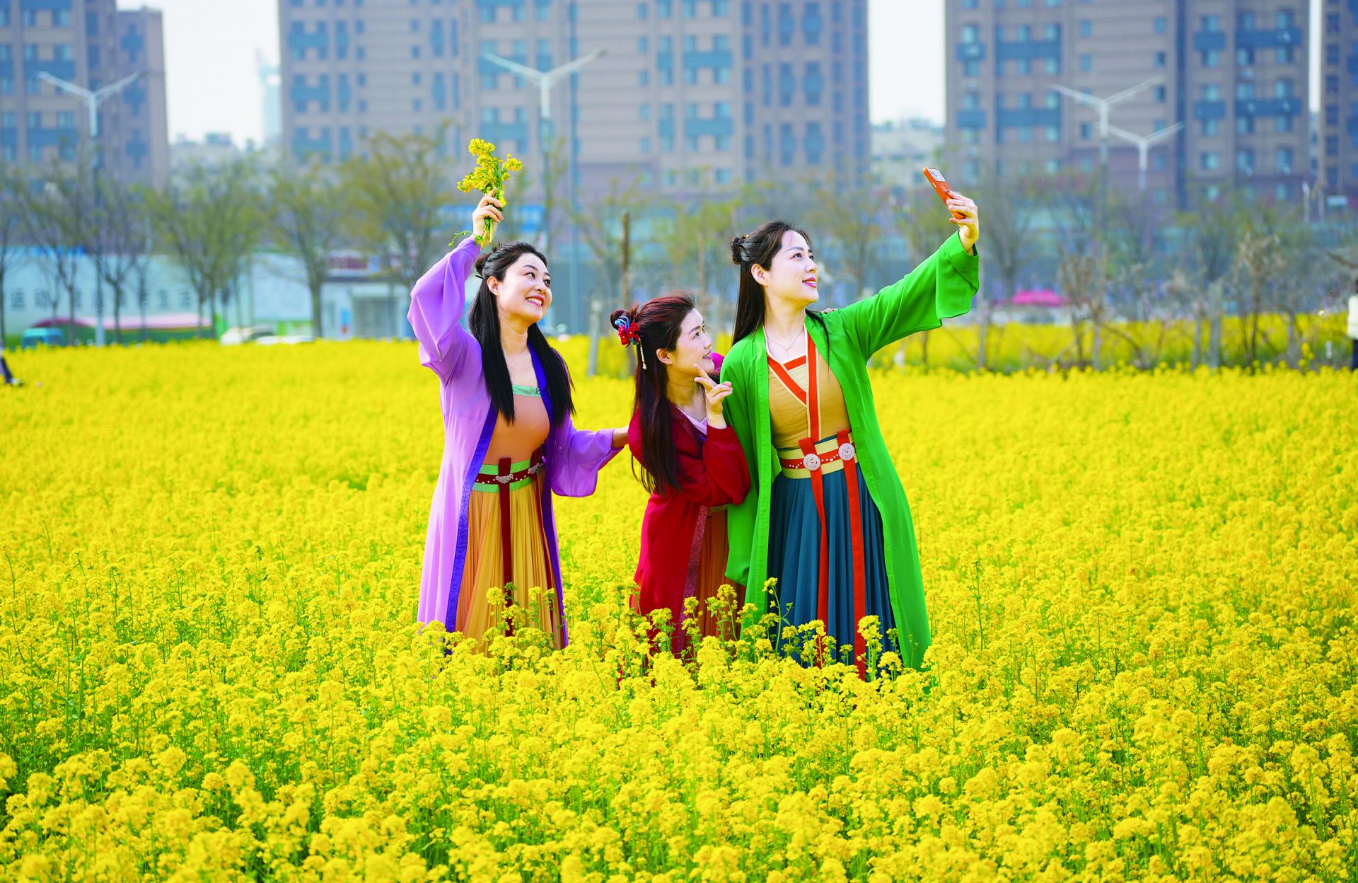 漯川花雨景区油菜花正值盛放,金黄铺展