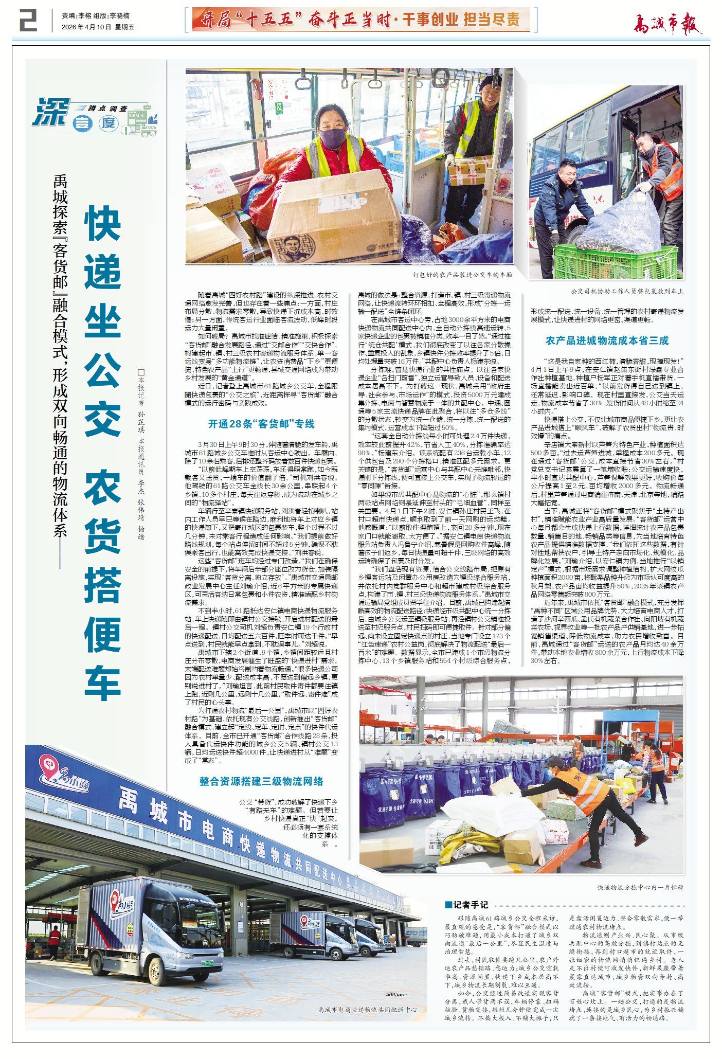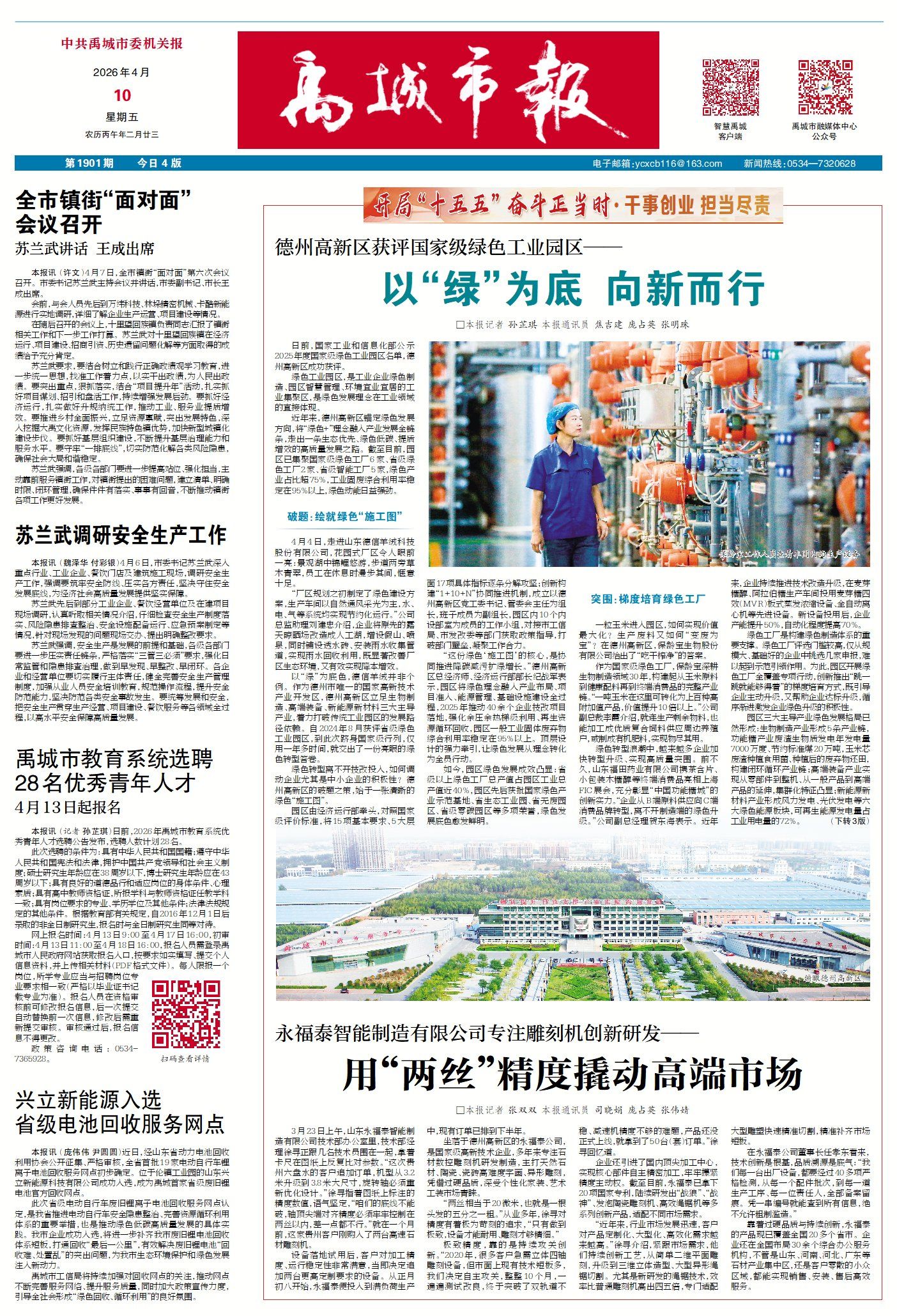 禹城市新闻周报(4月4日至4月10日) ©原创 2026-04-09 19:09 德州日报 0 ▶德州高新区获评国家级绿色工业园区 | 以“绿”为底 向新而行。(查看详情) ▶禹城探索“客货邮”融合模式,形成双向畅通的物流体系 | 快递坐公交 农货搭便车。(查看详情) ▶我为群众办实事 | 站前广场绿化完工、乡镇连接线施工、人民路北延推进——禹城市三大交通项目建设提速。(查看详情) ▶我为群众办实事 | 禹城市市中街道三友睦邻服务中心:家门口的“邻里会客厅”。(查看详情) ▶视觉 | 禹城:一城春色满城花。(查看详情) 德州日报新媒体出品编辑|李晓楠审核|李榕 终审|尹滨 (作者:德州日报)
