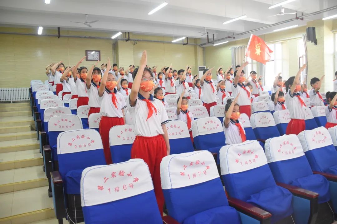 少先队大队辅导员宣读新入队名单,老队员为新队员佩戴红领巾;新队员在队旗下庄严宣誓,铿锵有力的誓言,响彻校园。新队员们在庄严神圣的入队仪式中接受了生动的思想教育,激发了爱党爱国情怀。