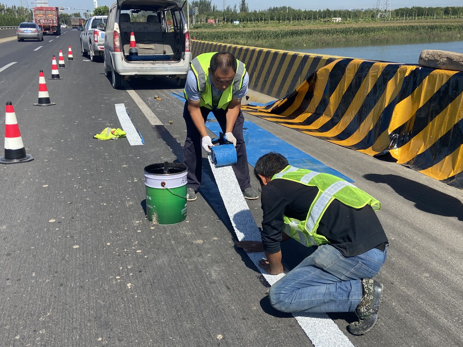 积极尝试新材料,提升道路通行环境。对S323部分龟裂标线采用龟裂修护贴进行病害处治,该新型材料具有施工简单、环保美观、经济耐用的特点,在节约养护成本、改善施工工法、检校耐用性方面均取得了良好的成效。
