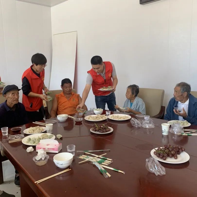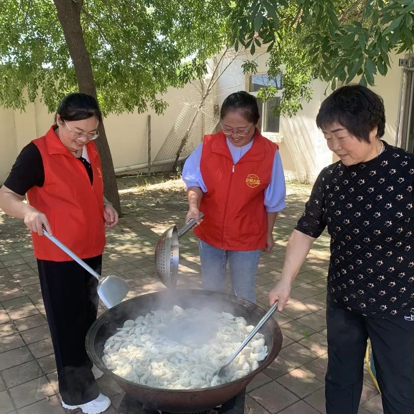在欢乐祥和的氛围中,志愿者为老人们盛饺子,大家围坐在桌前,吃着饺子聊着天,每个人的脸上都洋溢着幸福的笑容,呈现出一片欢声笑语、喜气洋洋的景象。
