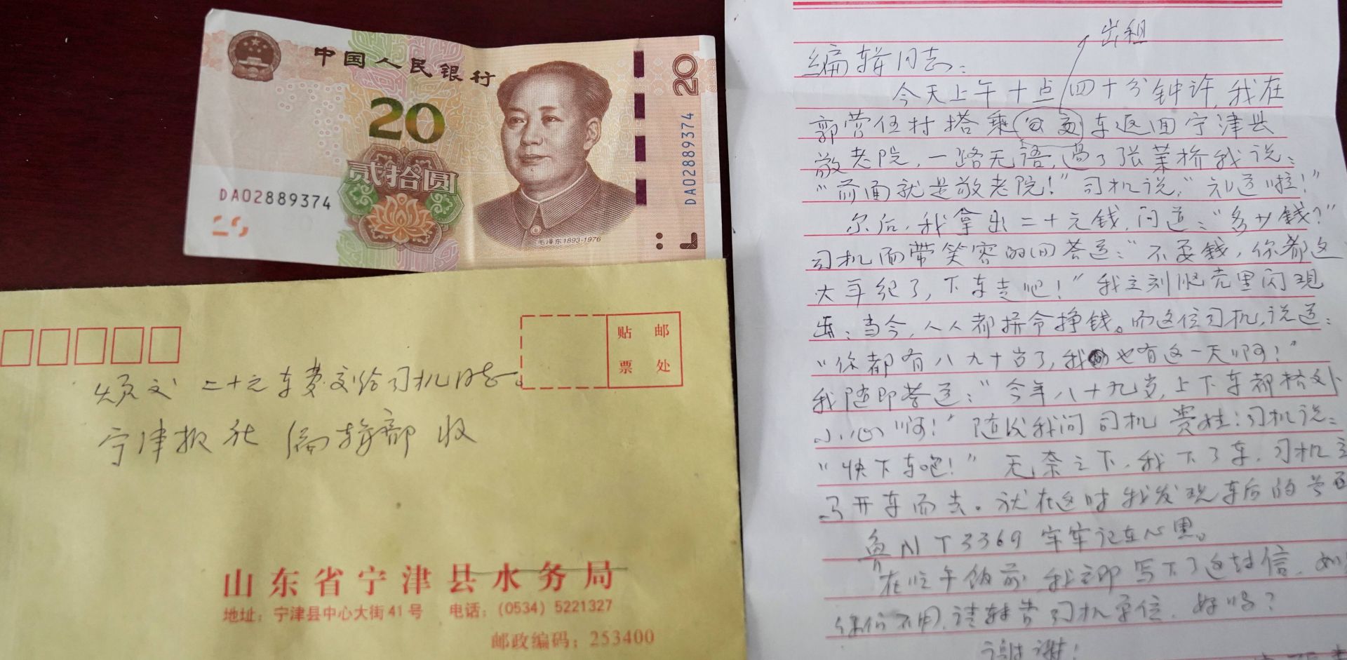 他缓慢骑行10多里路将被拒收的车费和感谢信