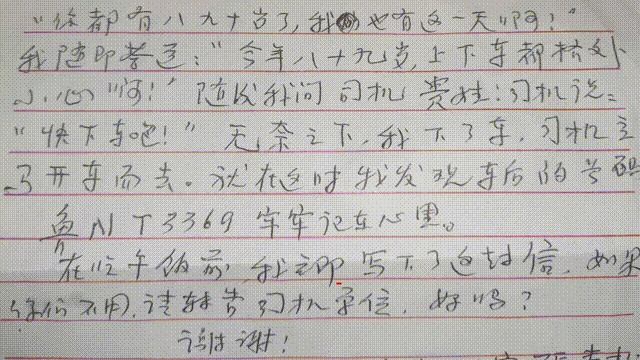 老人手写感谢信 来回骑行两小时