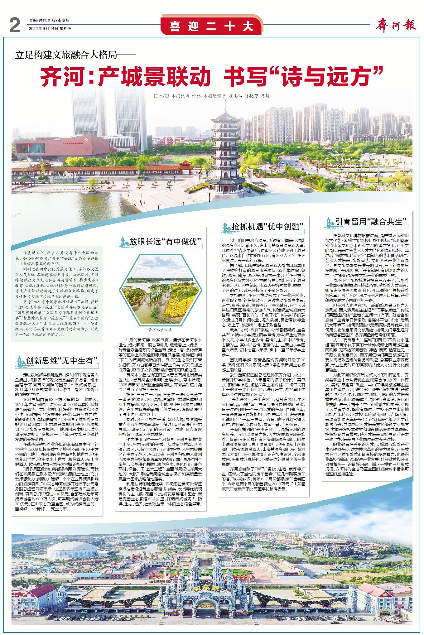“很多景区像泰山等都是利用资源建成,而我们在齐河是在原本没有旅游资源的土地上,充分发挥想象力、创造力,建起一个个在业界颇具影响力的旅游项目。”山东省坤河旅游开发有限公司常务副总经理刘妍表示,也正是多年坚持产业模式创新,项目总投资超过200亿元,全部建成后年可接待游客约600万人次,可实现旅游综合收入近30亿元,在山东省乃至全国,成为旅游行业的一面旗帜、一个标杆、一支生力军。