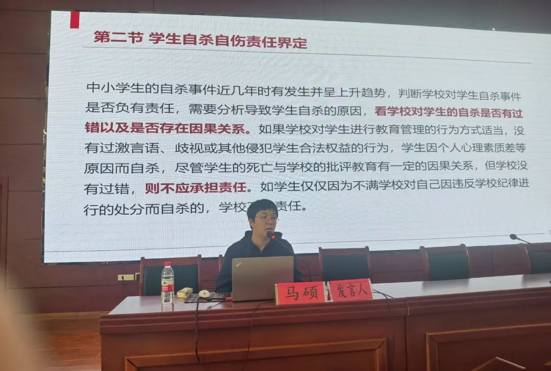对外经济贸易大学硕士、山东省学校安全研究与教育基地研究员马硕重点对学校安全责任界定与法律风险进行细致讲解。主要从学校安全事故责任主体、学校安全事故归责原则、一般人身伤害责任界定、学生自杀自伤责任界定、校园欺凌暴力责任界定、教师伤害事故责任界定、溺水事故多方责任界定、学校安全事故处置程序等多方面、全方位进行了讲述。