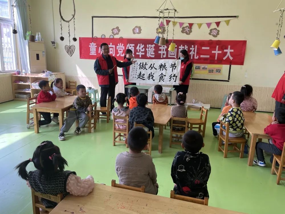 10月16日世界粮食日到来之际,为了让孩子们养成爱惜粮食的好习惯,乐陵市杨安镇联合乐陵市委办公室到千都苑新村中心幼儿园开展“童心向党颂华诞 书画献礼二十大”“节约粮食 从我做起”志愿服务活动。