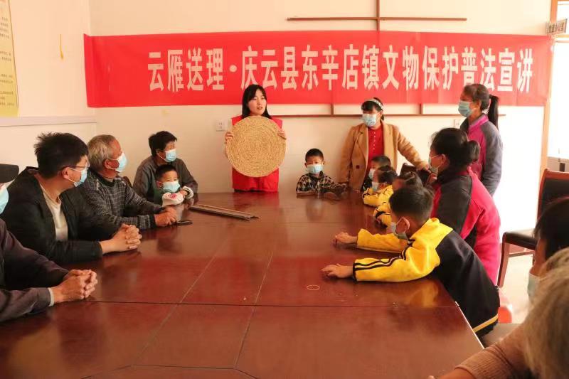 “大家看,这个扁平的座垫,又称蒲团,一般用香蒲草、麦秸等编成,宋代苏轼曾写过一首诗‘蒲团盘两膝,竹几阁双肘’……”11月1日,走近庆云县东辛店镇大丁庙村新时代文明实践站,志愿者正在开展“文物保护我来说”云雁送理宣讲活动。