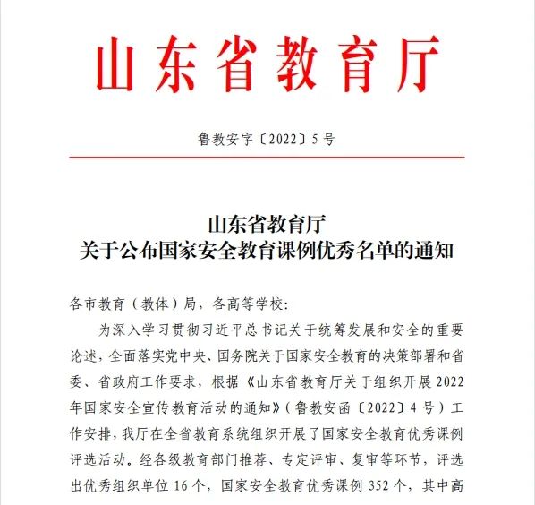 2022年2月至4月,山东省教育厅在全省教育系统组织开展了国家安全教育优秀课例评选活动。活动设小学组、初中组、高中组(包括中职)、高校组等4个组别,经各级教育部门推荐、专定评审、复审等环节,最终评选出国家安全教育优秀课例352个。德州市共有27个作品获奖,其中,一等奖4个,二等奖11个,三等奖12个,乐陵市有3个参赛作品获奖。