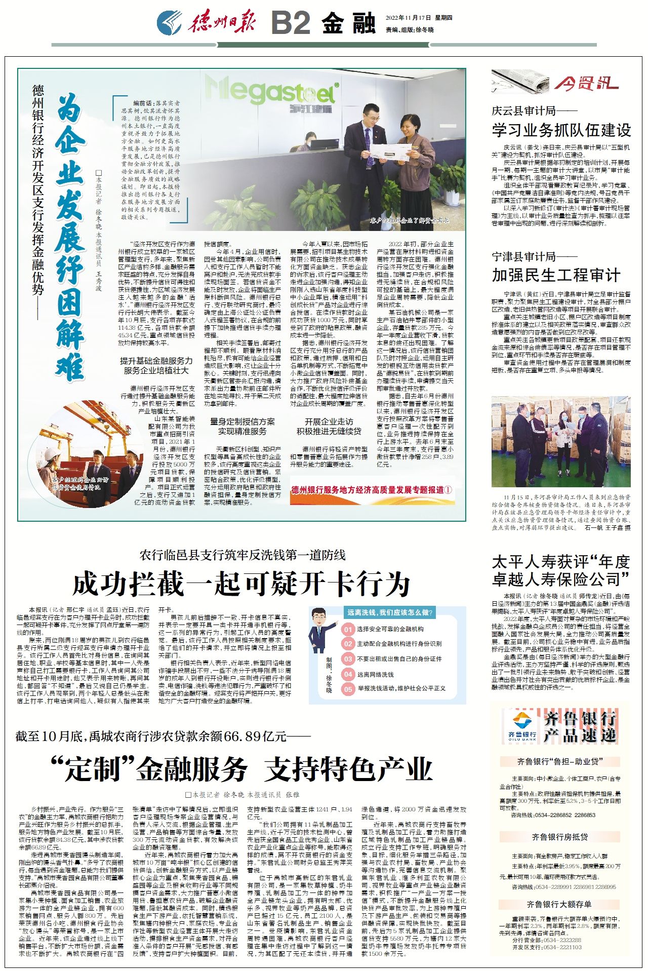 “经济开发区支行作为德州银行成立较早的一家城区管理型支行,多年来,聚焦新区产业结构多样、金融服务需求旺盛的特点,充分发挥自身优势,不断提升信贷可得性和获贷便捷性,为区域经济发展注入越来越多的金融‘活水’。”德州银行经济开发区支行行长胡大伟表示。截至今年10月底,支行各项存款达114.38亿元,各项贷款余额45.34亿元,重点领域信贷投放均保持较高水平。