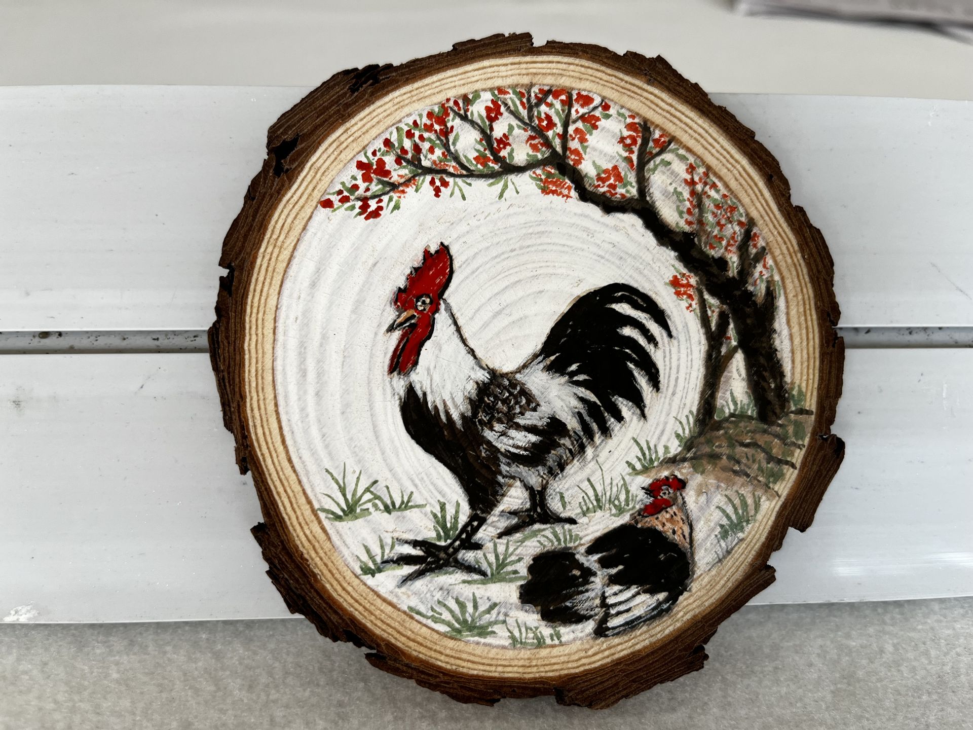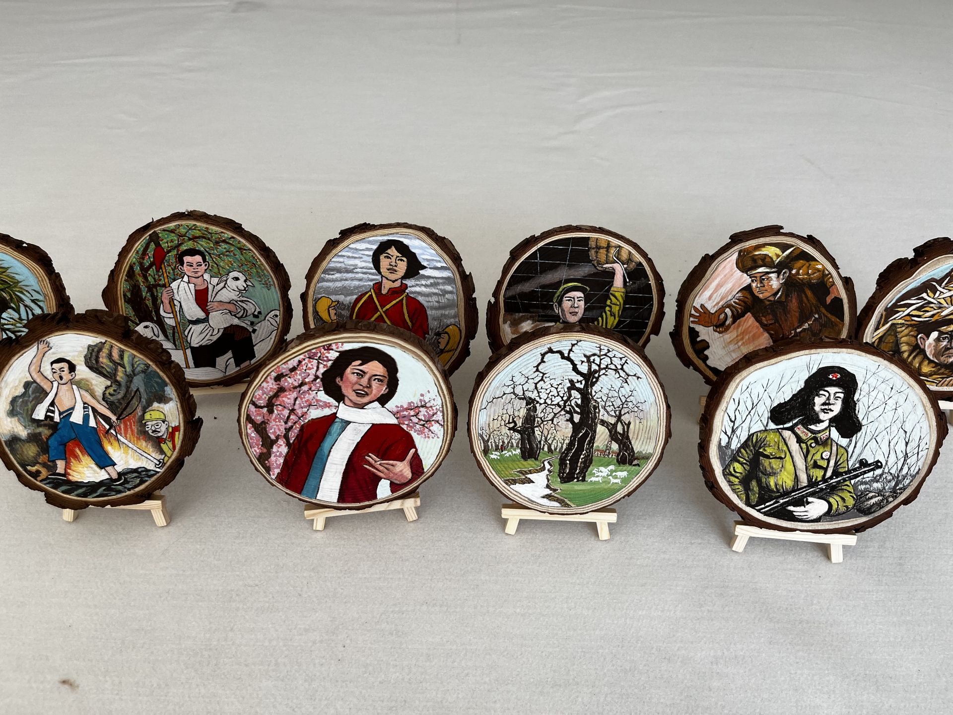 枣树作为枣乡乐陵的标志,成为了农民画家首选的素材,收集干枯枣树枝干,横向切成薄片,外围的树皮形成天然的画框,当木片染上颜料,自然的纹理透出画面与色彩融为一体时,那份独特的乡思乡愁夹杂着大自然的气息跃然而上。