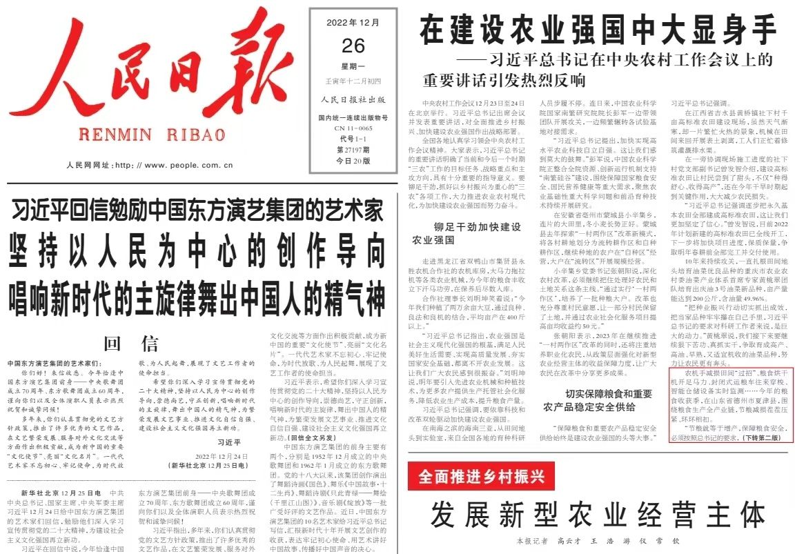 12月26日,《人民日报》要闻1版刊发《在建设农业强国中大显身手——习近平总书记在中央农村工作会议上的重要讲话引发热烈反响》,其中对夏津“切实保障粮食和重要农产品稳定安全供给”进行了报道。内容如下: